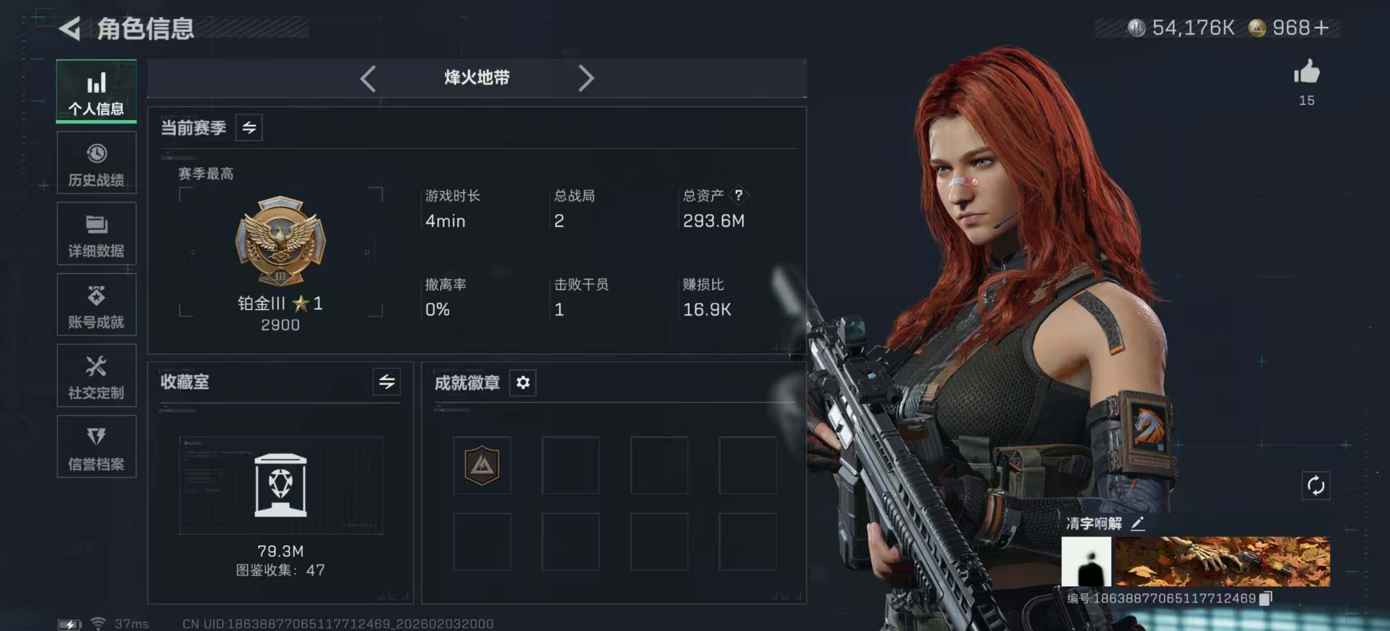 [16379471]【店主推荐捡漏号!可直接换绑】294m总资产-54176k哈伏币-60烽火等级-铂金-32战场等级-上等兵