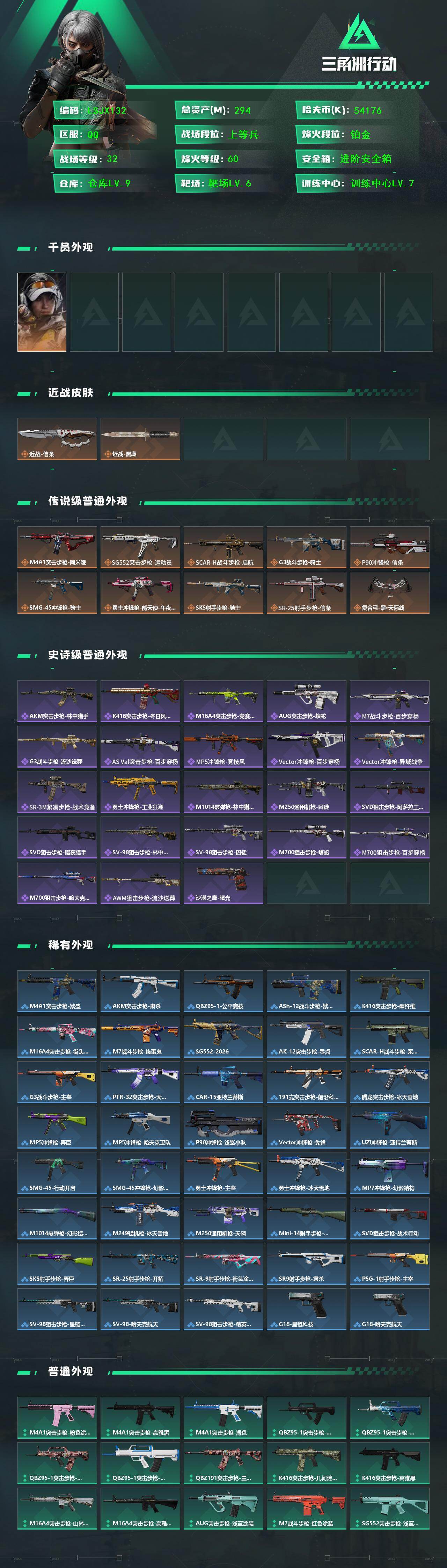 [16379471]【店主推荐捡漏号!可直接换绑】294m总资产-54176k哈伏币-60烽火等级-铂金-32战场等级-上等兵 【干员外观】:露娜-金牌射手 【近战皮肤】:近战-信条,近战-黑鹰 【传说外观】:M4A1突击步枪-阿米娅,SG552突击步枪-运动员,SCAR-H战斗步枪-启航,G3战斗步枪-骑士,P90冲锋枪-信条,SMG-45冲锋枪-骑士,勇士冲锋枪-能天使-午夜邮差,SKS射手步枪-骑士,SR-25射手步枪-信条,复合弓-黑·天际线 【史诗外观】:AKM突击步枪-林中猎手,K416突击步枪-冬日风情,M16A4突击步枪-竞赛选手,AUG突击步枪-蝮蛇,M7战斗步枪-百步穿杨,G3战斗步枪-流沙送葬,AS Val突击步枪-百步穿杨,MP5冲锋枪-竞技风,Vector冲锋枪-百步穿杨,Vector冲锋枪-异域战争,SR-3M紧凑突击步枪-战术竞备,勇士冲锋枪-工业狂潮,M1014霰弹枪-林中猎手,M250通用机枪-囚徒,SVD狙击步枪-阿萨拉工艺,SVD狙击步枪-暗夜猎手,SV-98狙击步枪-林中猎手,SV-98狙击步枪-囚徒,M700狙击步枪-蝮蛇,M700狙击步枪-百步穿杨,M700狙击步枪-哈夫克警备,AWM狙击步枪-流沙送葬,沙漠之鹰-曙光 【稀有外观】:M4A1突击步枪-繁盛,AKM突击步枪-肃杀,QBZ95-1突击步枪-公平竞技,ASh-12战斗步枪-繁盛,K416突击步枪-碳纤维,M16A4突击步枪-街头涂鸦,M7战斗步枪-捣蛋鬼,SG552突击步枪-2026,AK-12突击步枪-零点,SCAR-H战斗步枪-荣耀列队,G3战斗步枪-主宰,PTR-32突击步枪-天网,CAR-15突击步枪-亚特兰蒂斯,腾龙突击步枪-前沿科技,腾龙突击步枪-冰天雪地,MP5冲锋枪-弄臣,MP5冲锋枪-哈夫克卫队,P90冲锋枪-浅鲨小队,Vector冲锋枪-先锋,UZI冲锋枪-亚特兰蒂斯,SMG-45-行动开启,SMG-45冲锋枪-幻影结构,勇士冲锋枪-主宰,勇士冲锋枪-冰天雪地,MP7冲锋枪-幻影结构,M1014霰弹枪-幻影结构,M249轻机枪-冰天雪地,M250通用机枪-天网,Mini-14射手步枪-荣耀列队,SVD狙击步枪-战术行动,SKS射手步枪-弄臣,SR-25射手步枪-开拓,SR-9射手步枪-街头涂鸦,SR9射手步枪-肃杀,PSG-1射手步枪-主宰,SV-98狙击步枪