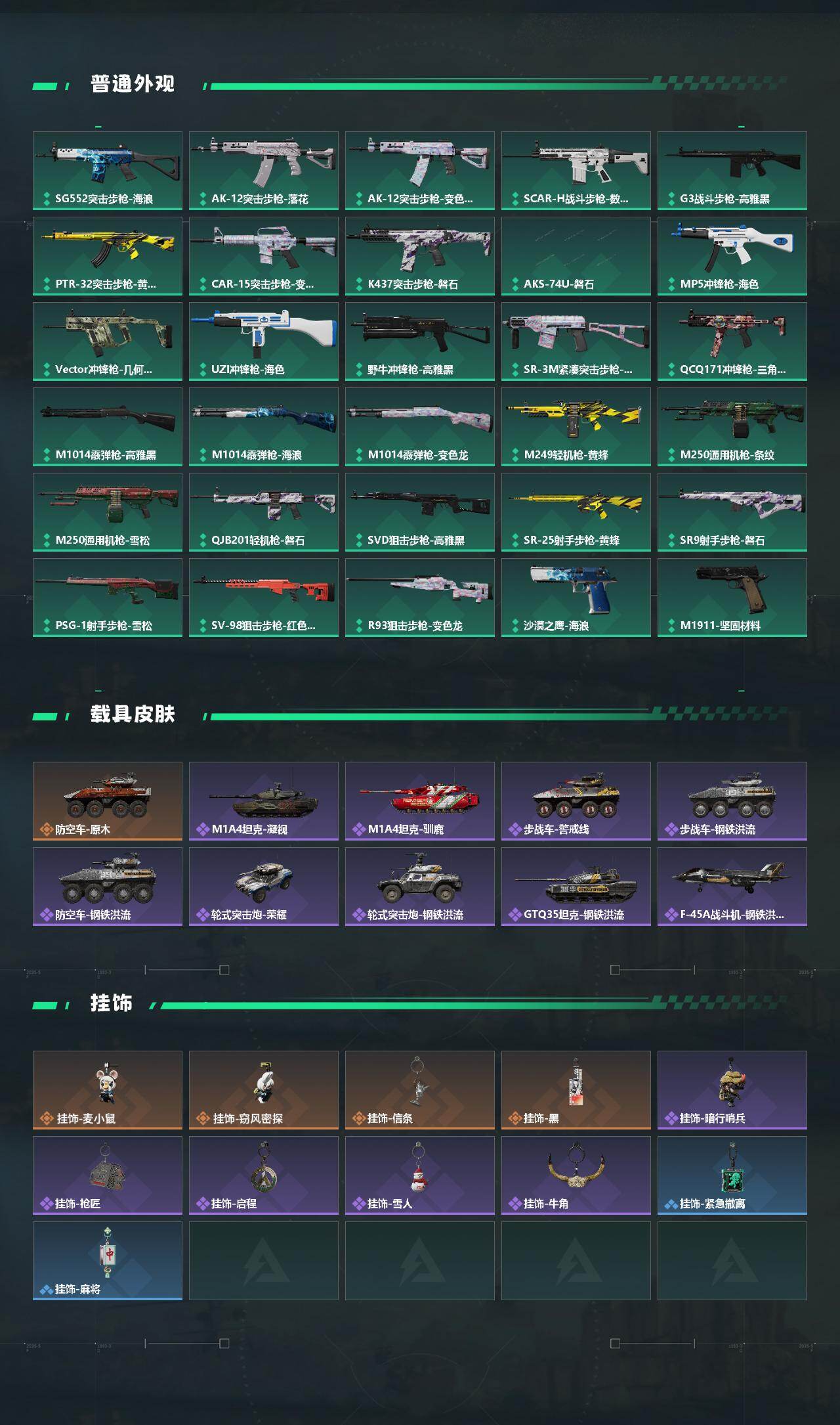 【稀有外观】:M4A1突击步枪-繁盛,AKM突击步枪-肃杀,QBZ95-1突击步枪-公平竞技,ASh-12战斗步枪-繁盛,K416突击步枪-碳纤维,M16A4突击步枪-街头涂鸦,M7战斗步枪-捣蛋鬼,SG552突击步枪-2026,AK-12突击步枪-零点,SCAR-H战斗步枪-荣耀列队,G3战斗步枪-主宰,PTR-32突击步枪-天网,CAR-15突击步枪-亚特兰蒂斯,腾龙突击步枪-前沿科技,腾龙突击步枪-冰天雪地,MP5冲锋枪-弄臣,MP5冲锋枪-哈夫克卫队,P90冲锋枪-浅鲨小队,Vector冲锋枪-先锋,UZI冲锋枪-亚特兰蒂斯,SMG-45-行动开启,SMG-45冲锋枪-幻影结构,勇士冲锋枪-主宰,勇士冲锋枪-冰天雪地,MP7冲锋枪-幻影结构,M1014霰弹枪-幻影结构,M249轻机枪-冰天雪地,M250通用机枪-天网,Mini-14射手步枪-荣耀列队,SVD狙击步枪-战术行动,SKS射手步枪-弄臣,SR-25射手步枪-开拓,SR-9射手步枪-街头涂鸦,SR9射手步枪-肃杀,PSG-1射手步枪-主宰,SV-98狙击步枪