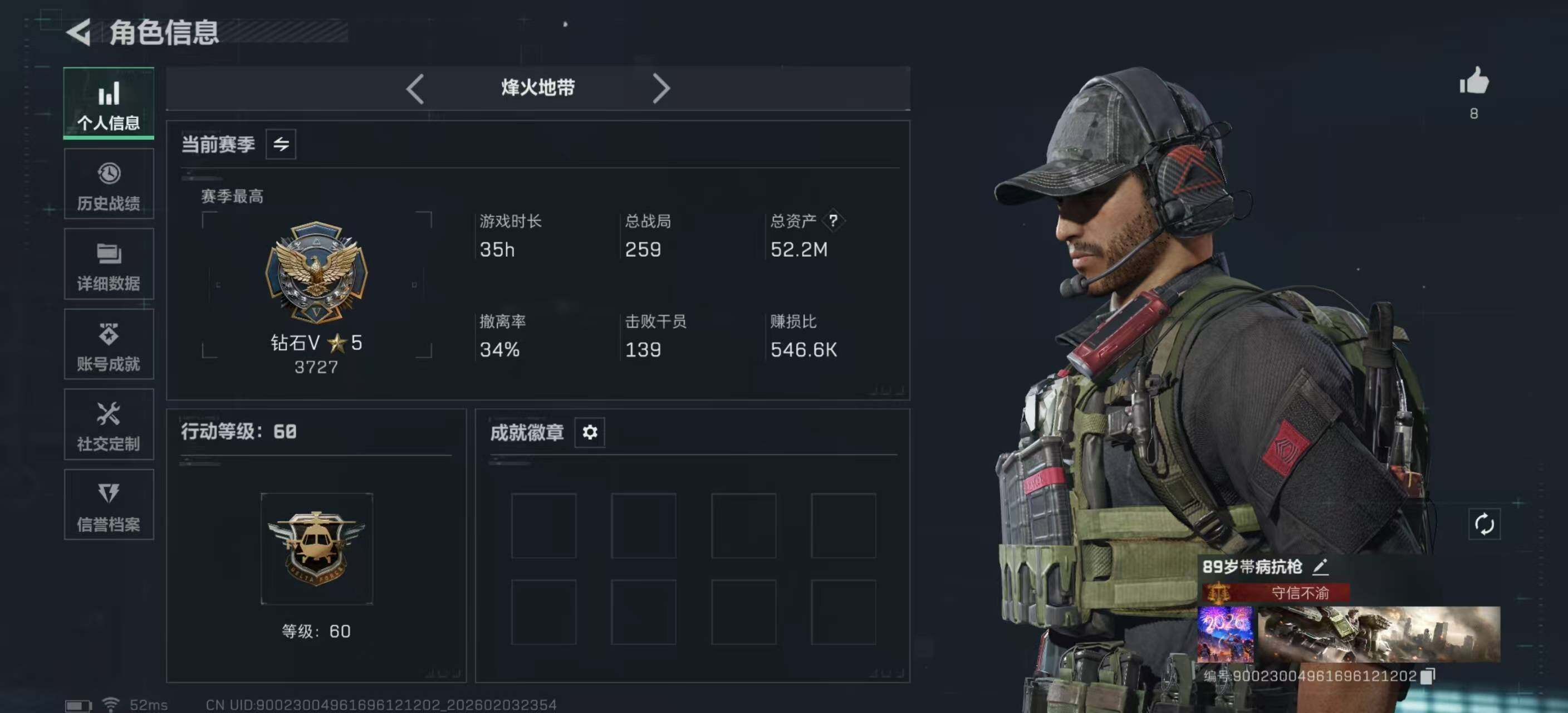 [16383923]【店主推荐捡漏号!可直接换绑】52m总资产-1607k哈伏币-60烽火等级-钻石-1战场等级-无军衔