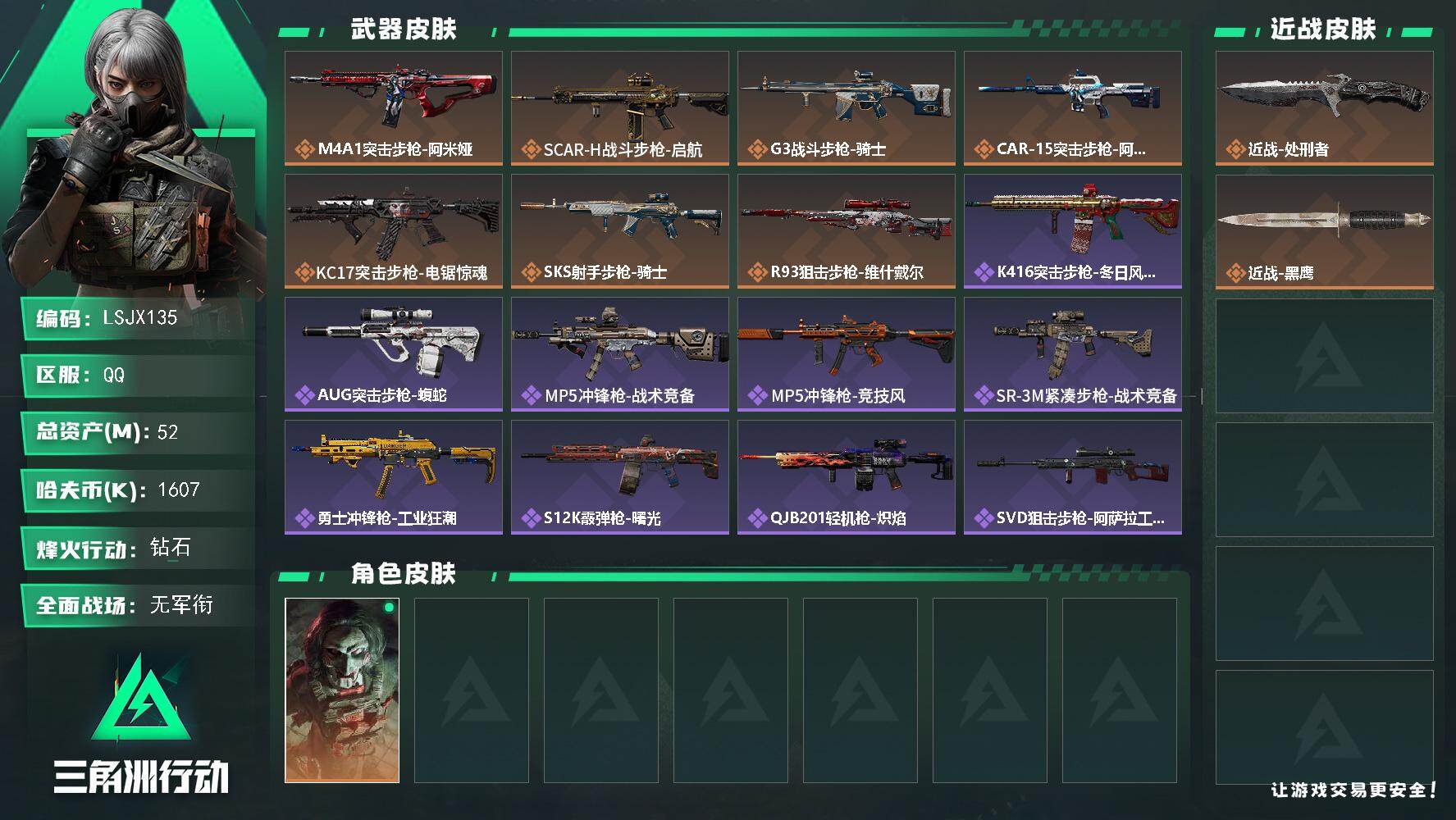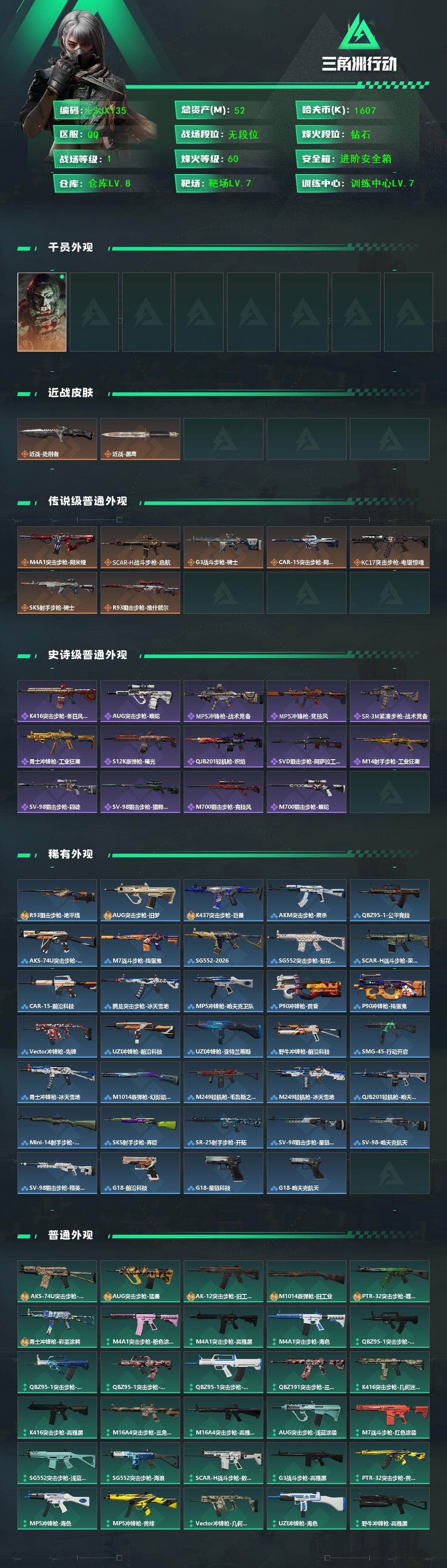[16383923]【店主推荐捡漏号!可直接换绑】52m总资产-1607k哈伏币-60烽火等级-钻石-1战场等级-无军衔 【干员外观】:红狼-电锯惊魂 【近战皮肤】:近战-处刑者,近战-黑鹰 【传说外观】:M4A1突击步枪-阿米娅,SCAR-H战斗步枪-启航,G3战斗步枪-骑士,CAR-15突击步枪-阿米娅,KC17突击步枪-电锯惊魂,SKS射手步枪-骑士,R93狙击步枪-维什戴尔 【史诗外观】:K416突击步枪-冬日风情,AUG突击步枪-蝮蛇,MP5冲锋枪-战术竞备,MP5冲锋枪-竞技风,SR-3M紧凑突击步枪-战术竞备,勇士冲锋枪-工业狂潮,S12K霰弹枪-曙光,QJB201轻机枪-炽焰,SVD狙击步枪-阿萨拉工艺,M14射手步枪-工业狂潮,SV-98狙击步枪-囚徒,SV-98狙击步枪-猎鳄行动,M700狙击步枪-竞技风,M700狙击步枪-蝮蛇 【稀有外观】:R93狙击步枪-地平线,AUG突击步枪-旧梦,K437突击步枪-巨兽,AKM突击步枪-肃杀,QBZ95-1突击步枪-公平竞技,AKS-74U突击步枪-前沿科技,M7战斗步枪-捣蛋鬼,SG552突击步枪-2026,SG552突击步枪-贴花艺术,SCAR-H战斗步枪-荣耀列队,CAR-15突击步枪-前沿科技,腾龙突击步枪-冰天雪地,MP5冲锋枪-哈夫克卫队,P90冲锋枪-黄昏,P90冲锋枪-捣蛋鬼,Vector冲锋枪-先锋,UZI冲锋枪-前沿科技,UZI冲锋枪-亚特兰蒂斯,野牛冲锋枪-前沿科技,SMG-45-行动开启,勇士冲锋枪-冰天雪地,M1014霰弹枪-幻影结构,M249轻机枪-毛鲁斯之力,M249轻机枪-冰天雪地,QJB201轻机枪-哈夫克卫队,Mini-14射手步枪-荣耀列队,SKS射手步枪-弄臣,SR-25射手步枪-开拓,SV-98狙击步枪-星链科技,SV-98狙击步枪-哈夫克航天,SV-98狙击步枪-精英联盟,G18-前沿科技,G18-星链科技,G18-哈夫克航天 【普通外观】:AKS-74U突击步枪-蛇纹涂装,AUG突击步枪-猛兽,AK-12突击步枪-旧工业,M1014霰弹枪-旧工业,PTR-32突击步枪-噬菌体,勇士冲锋枪-彩墨涂鸦,M4A1突击步枪-粉色涂装,M4A1突击步枪-高雅黑,M4A1突击步枪-海色,QBZ95-1突击步枪-高雅黑,QBZ95-1突击步枪-海浪,QBZ95-1突击步枪-三角洲力量,QBZ