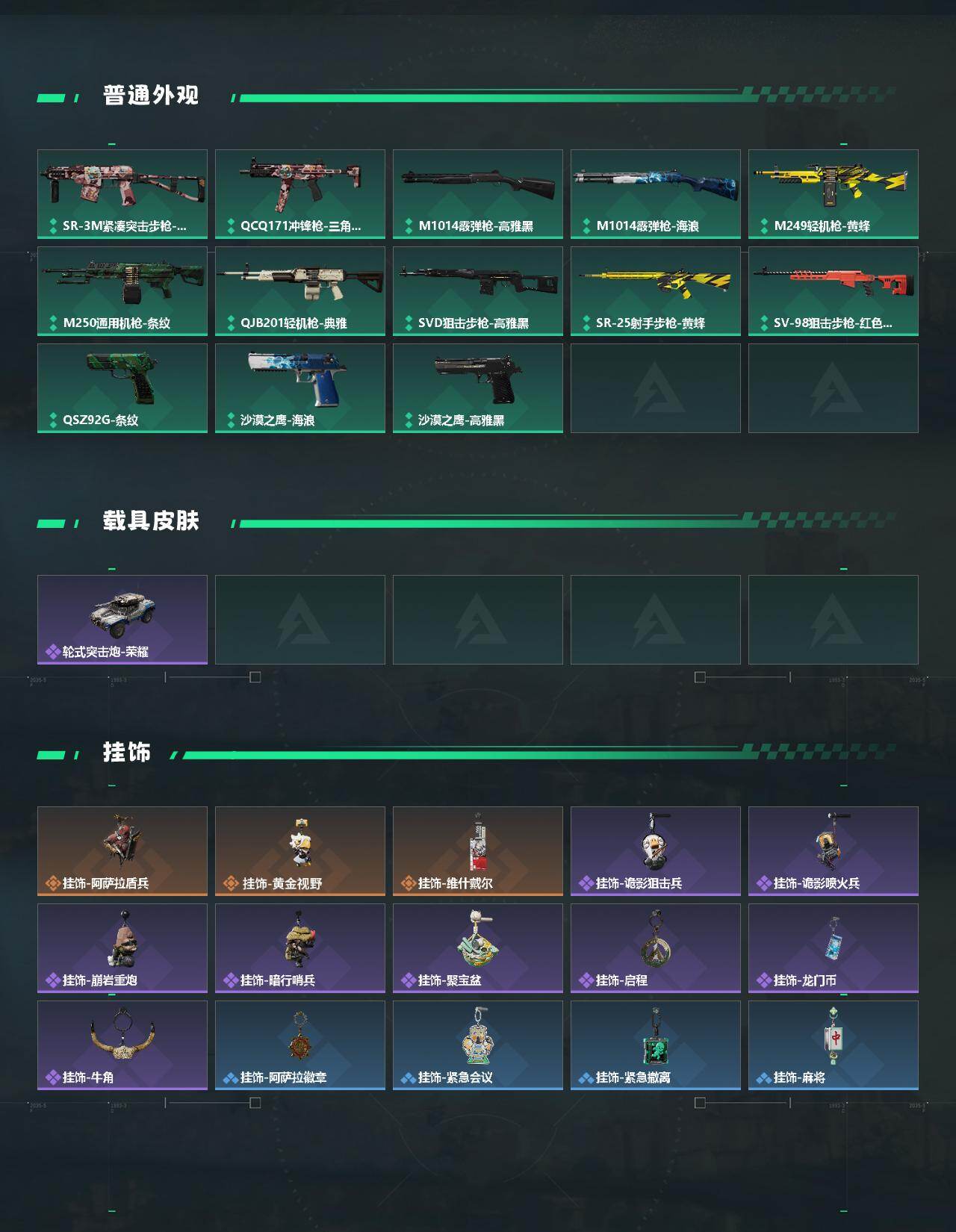 【稀有外观】:R93狙击步枪-地平线,AUG突击步枪-旧梦,K437突击步枪-巨兽,AKM突击步枪-肃杀,QBZ95-1突击步枪-公平竞技,AKS-74U突击步枪-前沿科技,M7战斗步枪-捣蛋鬼,SG552突击步枪-2026,SG552突击步枪-贴花艺术,SCAR-H战斗步枪-荣耀列队,CAR-15突击步枪-前沿科技,腾龙突击步枪-冰天雪地,MP5冲锋枪-哈夫克卫队,P90冲锋枪-黄昏,P90冲锋枪-捣蛋鬼,Vector冲锋枪-先锋,UZI冲锋枪-前沿科技,UZI冲锋枪-亚特兰蒂斯,野牛冲锋枪-前沿科技,SMG-45-行动开启,勇士冲锋枪-冰天雪地,M1014霰弹枪-幻影结构,M249轻机枪-毛鲁斯之力,M249轻机枪-冰天雪地,QJB201轻机枪-哈夫克卫队,Mini-14射手步枪-荣耀列队,SKS射手步枪-弄臣,SR-25射手步枪-开拓,SV-98狙击步枪-星链科技,SV-98狙击步枪-哈夫克航天,SV-98狙击步枪-精英联盟,G18-前沿科技,G18-星链科技,G18-哈夫克航天