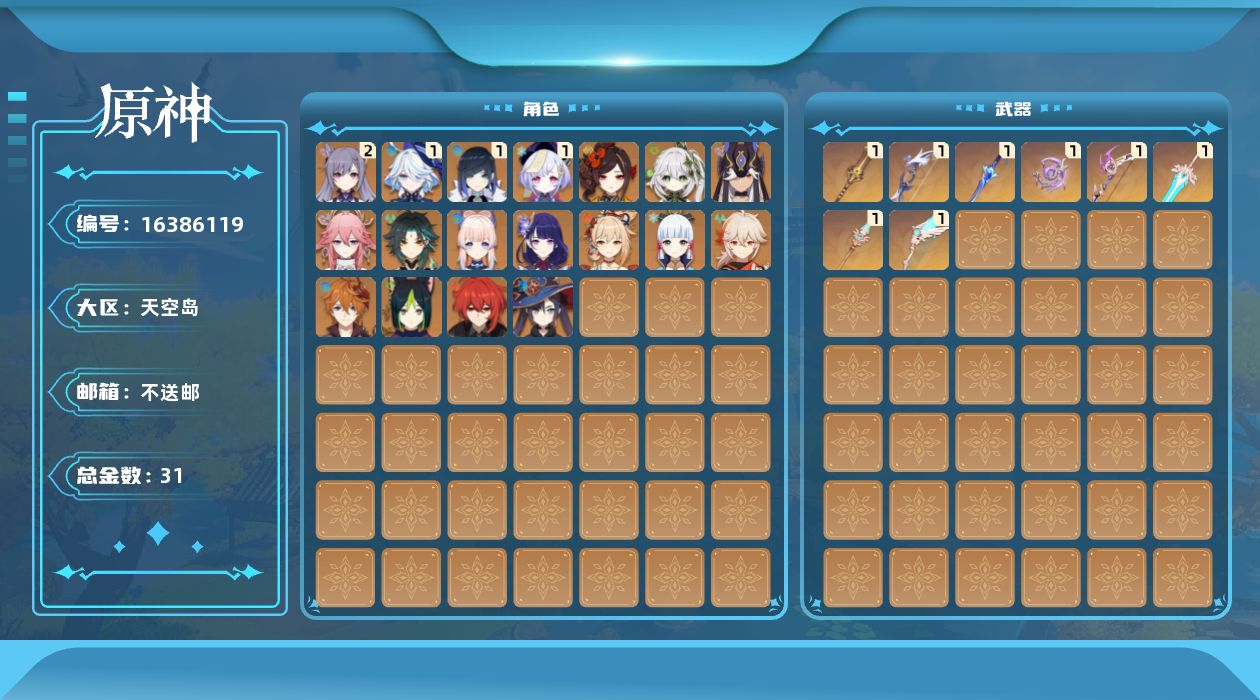 [16386119]58级/31黄/男主/18个五星角色/8个五星武器