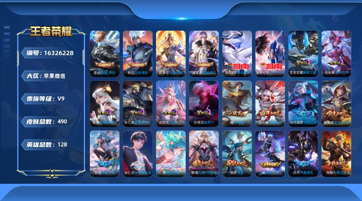 [16326228]钱包无法更改实名不影响游戏!找回包赔!介意勿拍!苹果WX-V10-最强王者段位-128英雄-490皮肤-4典藏皮肤-1典藏英雄-2珍品传说-58传说-161史诗-5天幕 【英雄全皮】:马可波罗全皮,达摩全皮,姜子牙全皮,刘邦全皮,孙权全皮,艾琳全皮,娜可露露全皮,橘右京全皮,李元芳全皮,狂铁全皮,米莱狄全皮,李信全皮,盾山全皮,猪八戒全皮,夏洛特全皮,金蝉全皮,戈娅全皮,影全皮 【荣耀典藏】:武则天英雄,李白鸣剑曳影,诸葛亮星域神启,花木兰九霄神辉,韩信弑枪猎影 【珍品传说】:马可波罗怪盗基德,鲁班七号江户川柯南 【传说皮肤】:后羿神树通天,桑启鸣野蒿,亚连落雪白狼,赵云乘龙铭钟鼎,澜逐花归海,艾琳觅芳踪,狄仁杰夜礼服假面,王昭君永恒水手月亮,鲁班七号时之奇旅,吕布遇见神鼓,宫本武藏惊梅引,云缨鹤归松栖,马可波罗妄想实况,东皇太一灼幽烈阳,亚瑟追逃游戏,夏洛特浮生妄,干将莫邪画中仙,花木兰燃星之曲,虞姬无限倾心,孙悟空齐天大圣,小乔山海琳琅生,李信山海炽霜斩,李白诗剑行,狄仁杰神器狴犴令,百里守约碎云,橘右京枫霜尽,娜可露露前尘镜,孙尚香音你闪耀,马可波罗深海之息,孙策挚爱之约,孙策末日机甲,瑶时之祈愿,裴擒虎寅虎赤拳,孙尚香异界灵契,赵云淬星耀世,王昭君乞巧织情,曜李逍遥 ,李元芳飞鸢探春,公孙离祈雪灵祝,镜炽阳神光,虞姬启明星使,李信一念神魔,刘备时之恋人,伽罗太华,貂蝉猫影幻舞,张良黄金白羊座,干将莫邪久胜战神,虞姬云霓雀翎,达摩黄金狮子座,后羿黄金射手座,杨戬永曜之星,貂蝉仲夏夜之梦,孙尚香末日机甲,宫本武藏地狱之眼,孙悟空地狱火,吕布天魔缭乱,武则天海洋之心,狄仁杰超时空战士 【限定皮肤】:姜子牙天穹之誓,狄仁杰阴阳师,小乔纯白花嫁,小乔山海琳琅生,赵云皇家上将,赵云龙胆,赵云百木心枪,墨子神迹守卫,嬴政白昼王子,孙尚香蔷薇恋人,孙尚香异界灵契,鲁班七号狮舞东方,鲁班七号乒乒小将,鲁班七号时之奇旅,庄周高山流水,高渐离死亡摇滚,阿轲迷踪丽影,钟无艳王者之锤,钟无艳超时空战士,孙膑天狼运算者,扁鹊奇幻香踪,白起夜都怪侠,芈月重明,芈月幻夜卜梦,吕布天魔缭乱,吕布猎兽之王,吕布御风骁将,吕布遇见神鼓,周瑜赤莲之焰,元歌云间偶戏,元歌无心,夏侯惇朔风刀,甄姬女儿国国王,甄姬落雪兰心,典韦穷奇,典韦蓝屏警告,典韦岱宗,马可波罗逐梦之星,马可波罗暗影游猎,马可波罗