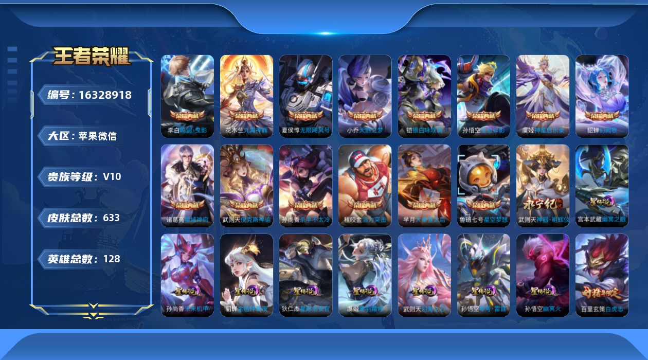 [16328918]苹果WX-V10-最强王者段位-128英雄-633皮肤-14典藏皮肤-1典藏英雄-10星元-1无双-79传说-235史诗