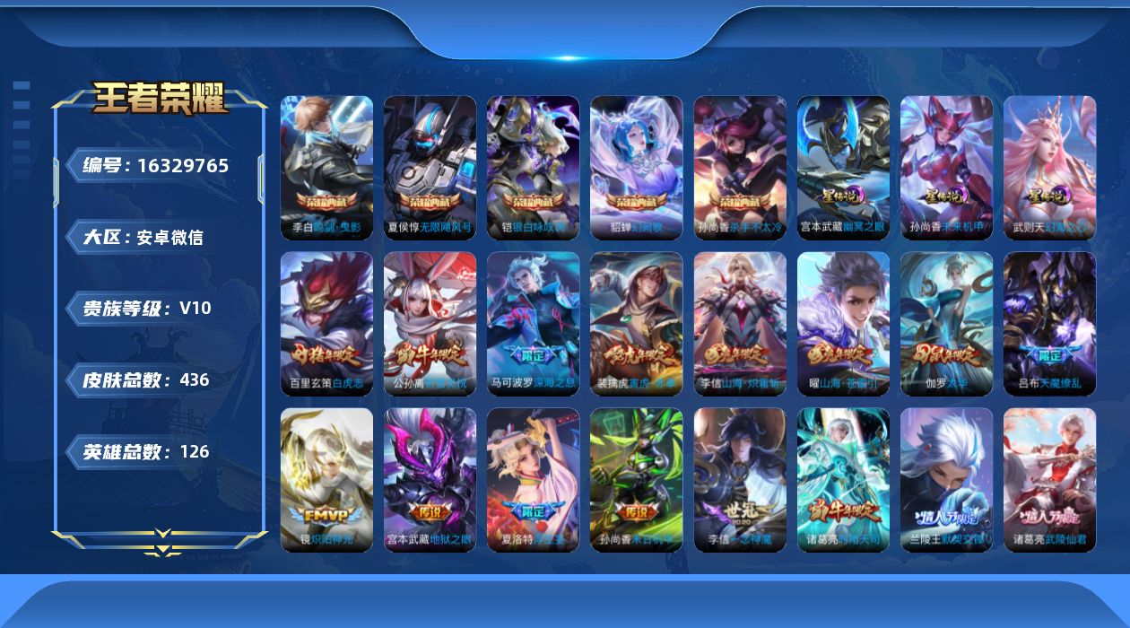 [16329765]安卓WX!信用分不足介意勿拍!V10-126英雄-436皮肤-5典藏皮肤-1典藏英雄-54传说-135史诗