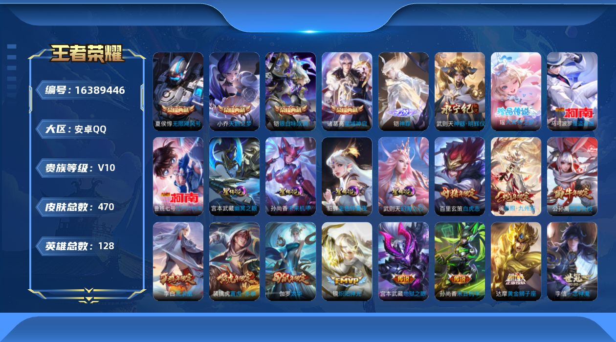[16389446]可二次【特价出售/店主推荐,打野45段,中路45段】,安卓Q-V10-最强王者段位-128英雄-470皮肤-4典藏皮肤-1典藏英雄-2无双-3珍品传说-41传说-150史诗 【英雄全皮】:刘禅全皮,达摩全皮,刘邦全皮,孙权全皮,钟馗全皮,太乙真人全皮,鬼谷子全皮,沈梦溪全皮,猪八戒全皮,阿古朵全皮,空空儿全皮,影全皮 【荣耀典藏】:武则天英雄,夏侯惇无限飓风号,小乔天鹅之梦,诸葛亮星域神启,铠银白咏叹调 【无双皮肤】:武则天神器明辉仪,铠神罪 【珍品传说】:马可波罗怪盗基德,鲁班七号江户川柯南,瑶大耳狗之梦 【传说皮肤】:后羿神树通天,澜愿照九州拓,云缨幻光神枪,王昭君映山客,桑启鸣野蒿,典韦战鼓燎原,艾琳觅芳踪,大乔时之奇旅,诸葛亮鹤羽星尊,干将莫邪画中仙,马超无双飞将,裴擒虎寅虎赤拳,鲁班七号寅虎瑞焰,孙尚香异界灵契,赵云淬星耀世,西施游龙清影,公孙离祈雪灵祝,诸葛亮时雨天司,镜炽阳神光,虞姬启明星使,关羽武圣,曜云鹰飞将,李信一念神魔,刘备时之恋人,伽罗太华,貂蝉猫影幻舞,张良黄金白羊座,虞姬云霓雀翎,达摩黄金狮子座,百里玄策白虎志,花木兰冠军飞将,梦奇胖达荣荣,后羿黄金射手座,诸葛亮武陵仙君,貂蝉仲夏夜之梦,李白凤求凰,孙尚香末日机甲,宫本武藏地狱之眼,孙悟空地狱火,武则天海洋之心,狄仁杰超时空战士 【限定皮肤】:白起狰,蔡文姬夏日便利店,虞姬夏日便利店,姜子牙天穹之誓,狄仁杰阴阳师,小乔纯白花嫁,虞姬凯尔特女王,廉颇寅虎御盾,赵云皇家上将,赵云龙胆,墨子神迹守卫,妲己时之彼端,嬴政优雅恋人,嬴政白昼王子,孙尚香蔷薇恋人,孙尚香异界灵契,鲁班七号狮舞东方,鲁班七号寅虎瑞焰,庄周蜃楼王,庄周高山流水,高渐离死亡摇滚,高渐离玩趣恶龙,阿轲迷踪丽影,孙膑妖精王,孙膑寅虎展翼,扁鹊炼金王,芈月重明,芈月白晶晶,芈月幻夜卜梦,吕布猎兽之王,吕布御风骁将,周瑜真爱至上,周瑜赤莲之焰,元歌云间偶戏,元歌无心,夏侯惇朔风刀,甄姬女儿国国王,甄姬游园惊梦,甄姬落雪兰心,曹操烛龙,曹操天狼征服者,典韦穷奇,马可波罗逐梦之星,马可波罗暗影游猎,狄仁杰魔术师,狄仁杰万华元夜,达摩星际陆战队,达摩沙漠行僧,项羽海滩派对,老夫子圣诞老人,老夫子醍醐杖,老夫子航海奇遇记,关羽冰锋战神,关羽武圣,安琪拉魔法小厨娘,程咬金演武夺筹,刘邦夺宝奇兵,韩信傲雪梅枪,王昭君凤凰于飞,兰陵王驯魔猎人