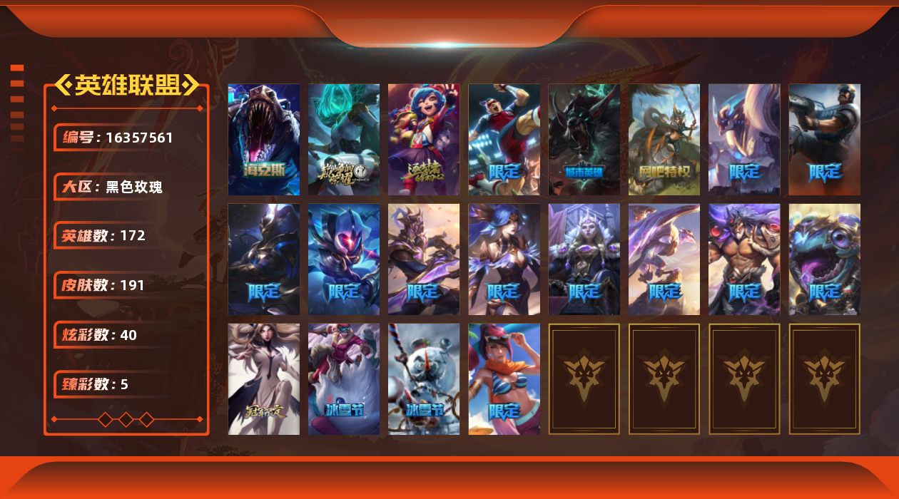 [16357561]【店主推荐捡漏号】未定级段位-172英雄-191皮肤-40炫彩-0终极-4神话-21限定-23传说-45史诗