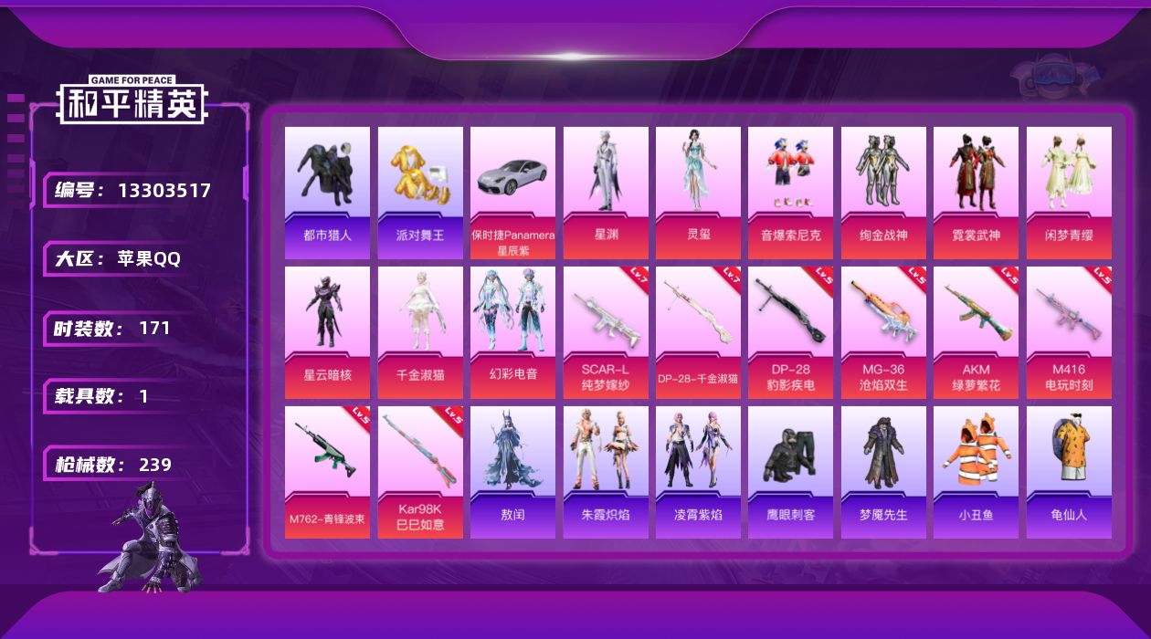 [13303517]【1519】苹果 手Q-9粉装-8特效枪-1载具-3粉色飞行器-77974热力值-18王牌印记-171套装-239枪皮 【热门品类】:粉装-音爆索尼克,套装-都市猎人,套装-派对舞王,套装-小丑鱼,套装-龟仙人,套装-粉红小猪 【粉色载具】:保时捷Panamera(星辰紫) 【粉色套装】:粉装-绚金战神,粉装-霓裳武神,粉装-音爆索尼克,粉装-闲梦青缨,角色-星云暗核,角色-千金淑猫,粉装-幻彩电音,角色-星渊,角色-灵玺 【粉色枪皮等级】:AKM-绿萝繁花(五级),SCAR-L-纯梦嫁纱(七级),M416-电玩时刻(五级),M762-青锋波束(五级),Kar98K-巳巳如意(五级),DP-28-千金淑猫(七级),DP-28-豹影疾电(五级),MG-36-沧焰双生(五级) 【粉色枪皮】:AKM-绿萝繁花,SCAR-L-纯梦嫁纱,M416-电玩时刻,M762-青锋波束,Kar98K-巳巳如意,DP-28-千金淑猫,DP-28-豹影疾电,MG-36-沧焰双生 【粉色飞行器】:星夜魔法师飞行翼,歌者泠鸢飞行器,无垠阁飞行器 【粉色降落伞】:海渊国主降落伞,筑梦精灵降落伞,彩虹甜喵降落伞,青空秋雨降落伞,歌者泠鸢降落伞,暗夜鎏金降落伞,飒粉甜心降落伞,天星战神降落伞,未来歌姬降落伞,闲梦青缨降落伞,圣堂之誓降落伞,江南烟雨降落伞,创世·救赎降落伞,未来领航者降落伞,幽焰骑士降落伞,千金淑猫降落伞,智耀战神降落伞,无垠阁降落伞 【稀有套装】:套装-龟仙人,套装-巳巳如意,套装-雏菊兔兔,套装-萝兰蝴蝶,套装-小熊娃娃,角色-多纳泰罗,套装-糖糖葫芦,套装-青团波波,套装-棉花软糖,角色-都市丽猫,角色-摩登魅猫,角色-怀庆长公主,套装-燕燕于飞,套装-鱼渊荷华,套装-粉恋花,套装-紫幽梦,套装-蓝冰羽,角色-猎影月神,角色-绛羽幽主,套装-朱霞炽焰,套装-凌霄紫焰,角色-敖闰 【稀有枪皮】:AKM-彩虹符号,AKM-影袭,AKM-星之彼岸,AKM-灼热熔岩,AKM-破晓战魂,AKM-筑梦精灵,AKM-虎虎生威,AKM-霓虹街区,AKM-龙的传人,M16A4-幻世战舞者,M16A4-甜心亚梦,M16A4-莲影清波,M16A4-千金淑猫,SCAR-L-玉兔迎春,SCAR-L-红色方程式,SCAR-L-黄金龙骨,M416-糯团青竹,M416-红色方程式,M416-绯红前夜,M41