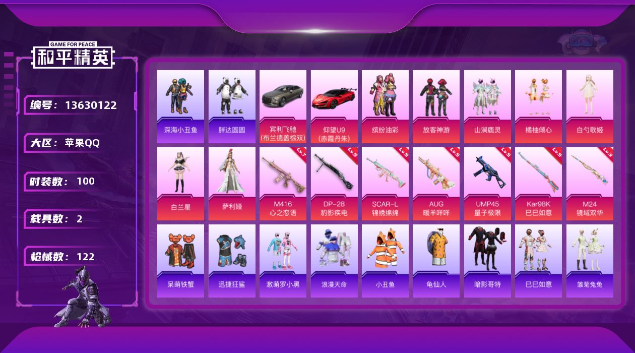 [13630122]【1541】苹果 手Q-7粉装-7特效枪-2载具-2粉色飞行器-42665热力值-8王牌印记-100套装-122枪皮