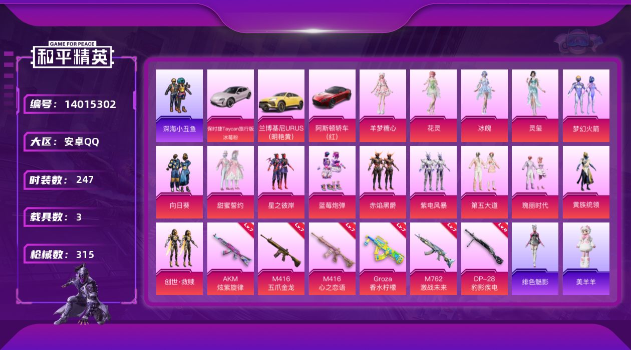 [14015302]【1578】安卓 手Q-15粉装-6特效枪-3载具-2粉色飞行器-110444热力值-19王牌印记-247套装-315枪皮 【热门品类】:粉装-梦幻火箭,绝对防御上衣,套装-深海小丑鱼,角色-军刀雅典娜,套装-暗夜行者,套装-AG战队服,套装-龟仙人,套装-粉红小猪 【粉色载具】:兰博基尼URUS(明艳黄),阿斯顿马丁DBS(红),保时捷Taycan 旅行版(冰莓粉) 【粉色套装】:粉装-梦幻火箭,粉装-向日葵,粉装-甜蜜誓约,粉装-星之彼岸,粉装-蓝莓炮弹,粉装-赤焰黑爵,粉装-紫电风暴,粉装-第五大道,粉装-瑰丽时代,粉装-黄族统领,套装-创世·救赎,角色-花灵,角色-冰魄,角色-灵玺,角色-羊梦糖心 【粉色枪皮等级】:AKM-炫紫旋律(七级),M416-五爪金龙(七级),M416-心之恋语(七级),GROZA-香水柠檬(七级),M762-激战未来(七级),DP-28-豹影疾电(四级) 【粉色枪皮】:AKM-炫紫旋律,M416-五爪金龙,M416-心之恋语,GROZA-香水柠檬,M762-激战未来,DP-28-豹影疾电 【粉色飞行器】:星夜魔法师飞行翼,黄族统领飞行器 【粉色降落伞】:梦幻火箭降落伞,华贵君王降落伞,天启纪元降落伞,PEL轰鸣竞梦者降落伞,神秘黑猫降落伞,甜蜜誓约降落伞,马卡龙降落伞,诡面斩降落伞,香水柠檬降落伞,筑梦精灵降落伞,炙焰牛王降落伞,音爆索尼克降落伞,纯梦嫁纱降落伞,飒粉甜心降落伞,黄族统领降落伞,精灵梦叶罗丽降落伞,喜羊羊与灰太狼降落伞,魔童闹海 敖丙降落伞,异瞳寒姬降落伞 【稀有套装】:套装-龟仙人,套装-糖糖葫芦,套装-青团波波,角色-临安公主,套装-朱霞炽焰,套装-凌霄紫焰,玩偶服-美羊羊,玩偶服-喜羊羊,角色-绯色魅影 【稀有枪皮】:AKM-夜灯,AKM-彩虹符号,AKM-灼热熔岩,AKM-王牌投手,AKM-生命誓言,AKM-百万伏特,AKM-萌趣颜团子,AKM-虎虎生威,AKM-霓虹街区,AKM-龙的传人,M16A4-夜灯,M16A4-幻世战舞者,M16A4-机械英豪,M16A4-甜心亚梦,M16A4-蓝色火焰,SCAR-L-暗夜玫瑰,SCAR-L-炫彩节奏,SCAR-L-玉兔迎春,SCAR-L-甜蜜誓约,SCAR-L-生命誓言,SCAR-L-红色方程式,SCAR-L-银碳小老虎,M416-仓鼠灰灰,M416-夜灯,M4