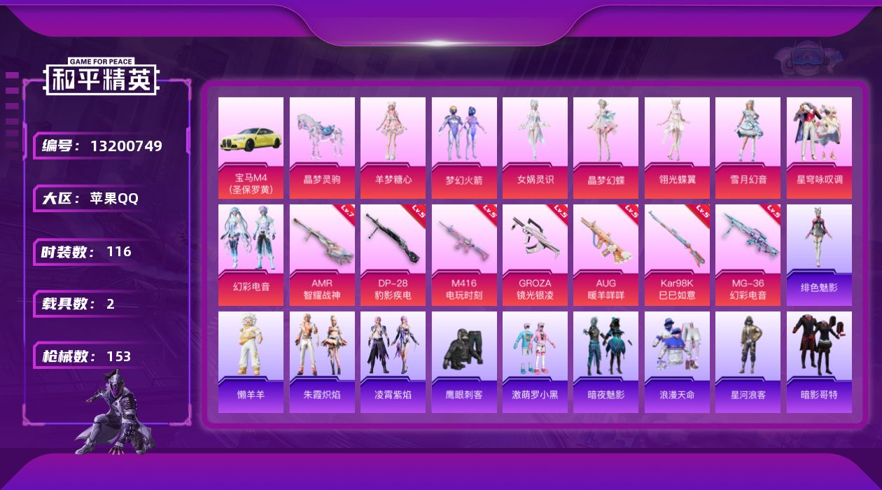 [13200749]【1509】苹果 手Q-8粉装-7特效枪-2载具-3粉色飞行器-54315热力值-6王牌印记-116套装-153枪皮 【热门品类】:粉装-梦幻火箭,套装-浪漫天命,套装-星河浪客,套装-暗影哥特 【粉色载具】:宝马M4(圣保罗黄),晶梦灵驹 【粉色套装】:粉装-梦幻火箭,角色-女娲灵识,角色-晶梦幻蝶,角色-翎光蝶翼,粉装-雪月幻音,粉装-星穹咏叹调,粉装-幻彩电音,角色-羊梦糖心 【粉色枪皮等级】:M416-电玩时刻(五级),GROZA-镜光银凌(五级),AUG-暖羊咩咩(五级),Kar98K-巳巳如意(五级),AMR-智耀战神(七级),DP-28-豹影疾电(五级),MG-36-幻彩电音(五级) 【粉色枪皮】:M416-电玩时刻,GROZA-镜光银凌,AUG-暖羊咩咩,Kar98K-巳巳如意,AMR-智耀战神,DP-28-豹影疾电,MG-36-幻彩电音 【粉色飞行器】:冰川粉黛飞行器,彩虹独角兽飞行器,终晖之翼飞行器 【粉色降落伞】:春暖花开降落伞,梦幻火箭降落伞,神秘黑猫降落伞,甜蜜誓约降落伞,花间之火降落伞,恐龙拽拽降落伞,垂柳戏鸭降落伞,仲夏莫吉托降落伞,晶梦幻蝶降落伞,彩虹独角兽降落伞,月下星之子降落伞,樱桃泡泡降落伞,雪月幻音降落伞,星穹咏叹调降落伞,幻彩电音降落伞,冷漠罗丽降落伞,绯穹魔姬降落伞,喜羊羊与灰太狼降落伞 【稀有套装】:套装-巳巳如意,套装-小鸟芋圆,套装-燕燕于飞,套装-鱼渊荷华,玩偶服-小狗蛇点点,套装-晶灵使者,套装-晶辉守护,角色-蜜桃派对,套装-风舞幻音,套装-粉恋花,套装-紫幽梦,套装-蓝冰羽,套装-星影赞美诗,套装-星渊小夜曲,套装-霓虹热舞,套装-极速光影,套装-彩虹兔,套装-云朵鹅,套装-雪绒豹,角色-灵公主,套装-朱霞炽焰,套装-凌霄紫焰,玩偶服-懒羊羊,角色-绯色魅影 【稀有枪皮】:AKM-夜灯,AKM-灼热熔岩,AKM-破晓战魂,AKM-萌趣颜团子,AKM-棋盘冕主,M16A4-幻世战舞者,SCAR-L-炫彩节奏,SCAR-L-玉兔迎春,SCAR-L-小狗蛇点点,M416-潮汐统领,M416-糯团青竹,M416-绿野极光,M416-萌萌史莱姆,GROZA-恐龙拽拽,GROZA-晶梦幻蝶,AUG-耀粉歌者,QBZ-原初圣火,M762-天降萌叽,M762-牛气冲天,M762-第五大道,M762-云朵鹅,Mk47-妙红点