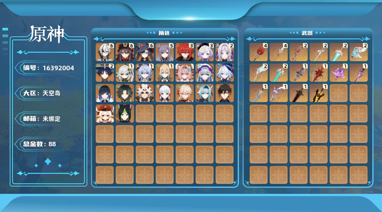 满命阿蕾奇诺,满命莫娜,0命芙宁娜,2命流浪者,1命纳西妲,0命提纳里,0命夜兰,0命荒泷一斗,0命优菈,0命枫原万叶,0命神里绫华,0命钟离,满命胡桃,1命甘雨,0命魈,0命可莉,5命刻晴,3命七七,1命琴,3命迪卢克,2命茜特菈莉,0命梦见月瑞希,0命瓦雷莎,精1赦罪,精1赤月之形,精2最初的大魔术,精1神乐之真意,精1雾切之回光,精1苍古自由之誓,精1无工之剑,精4护摩之杖,精4天空之脊,精2天空之翼,精1阿莫斯之弓,精2天空之刃,精2天空之卷,精2风鹰剑,精1狼的末路,精2天空之傲