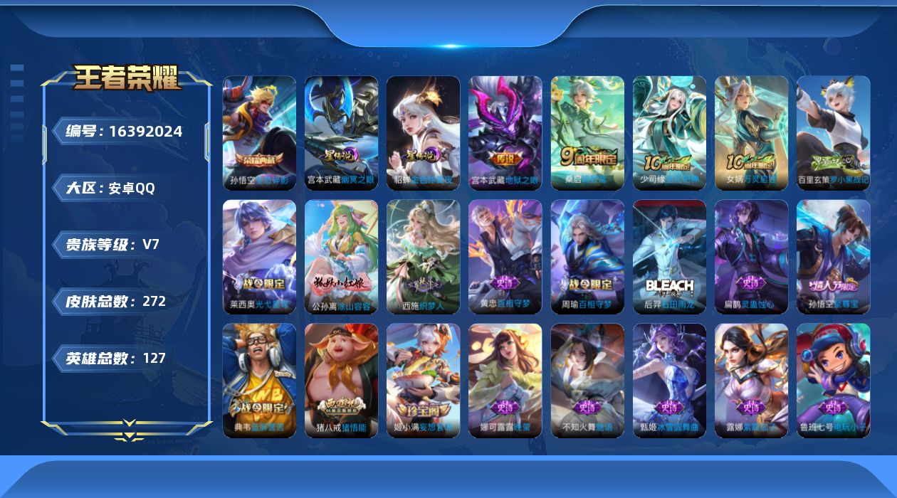 [16392024]【特价急出/详情看图】安卓Q-V7-最强王者段位-127英雄-272皮肤-1典藏皮肤-2星元-4传说-83史诗