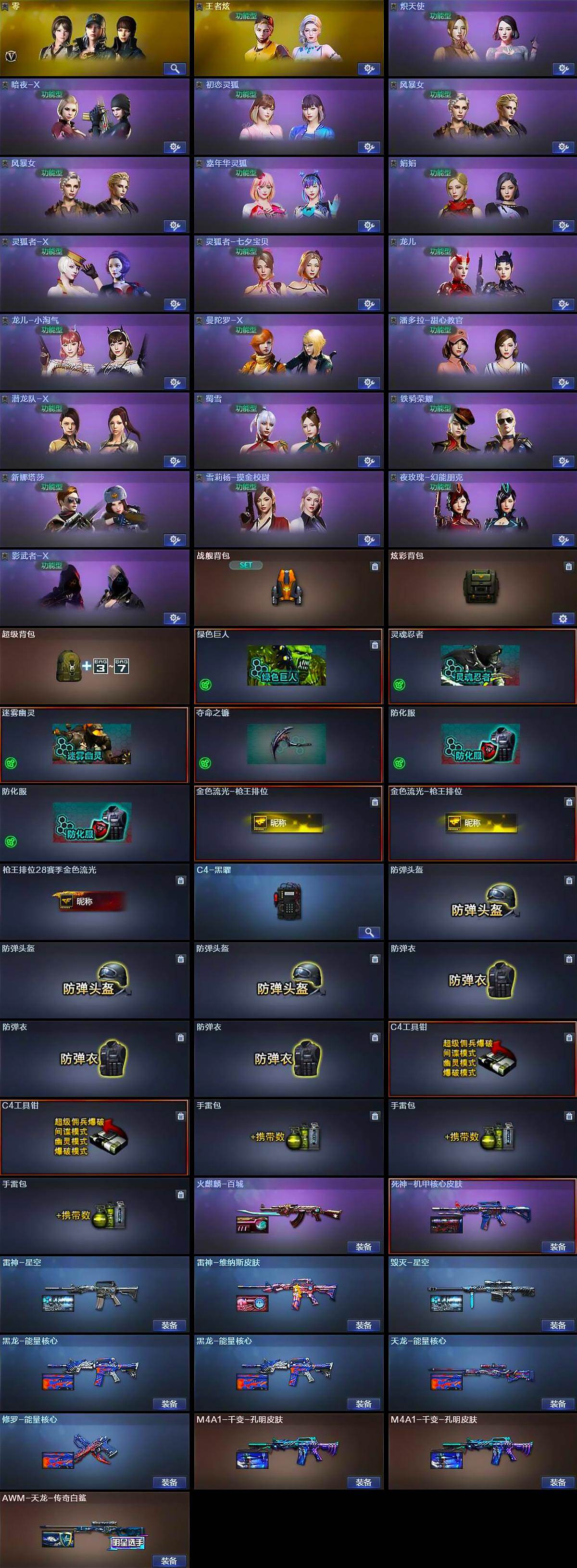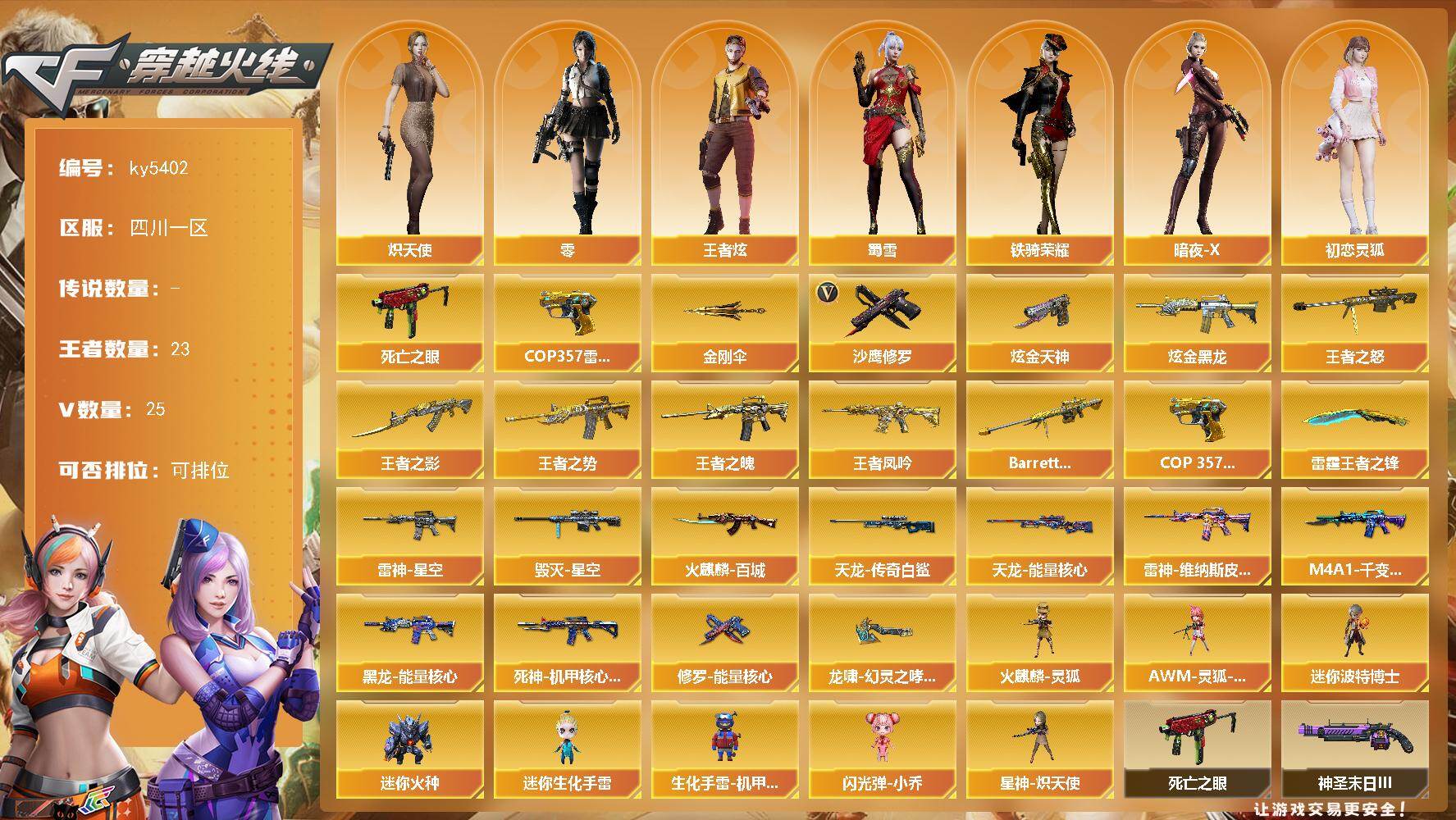 [16393601]四川一区-34V-23王者武器数-2炫金武器数 【热门武器】:死亡之眼,COP 357-雷霆王者,沙鹰-修罗,金刚伞 【王者炫金武器】:王者之势,王者之影,王者之魄,王者凤吟,王者之怒,Barrett-雷霆王者,COP 357-雷霆王者,雷霆王者之锋*2,炫金黑龙,炫金天神 【皮肤】:雷神-星空,雷神-维纳斯皮肤,火麒麟-百城,毁灭-星空,M4A1-千变-孔明皮肤*2,黑龙-能量核心*2,死神-机甲核心皮肤,天龙-能量核心,AWM-天龙-传奇白鲨,修罗-能量核心,龙啸-幻灵之哮 皮肤 【角色】:零,王者炫,炽天使,暗夜-X,初恋灵狐,风暴女*2,嘉年华灵狐,娟娟,灵狐者-X,灵狐者-七夕宝贝,龙儿,龙儿-小淘气,曼陀罗-X,潘多拉-甜心教官,潜龙队-X,蜀雪,铁骑荣耀,新娜塔莎,雪莉杨-摸金校尉,夜玫瑰-幻能朋克,影武者-X 【人偶武器】:星神-炽天使,火麒麟-灵狐,AWM-灵狐-15周年嘉年华,迷你波特博士*3,迷你火种*2,迷你生化手雷,生化手雷-机甲核心*2,闪光弹-小乔 【暴走生化】:死亡之眼 【挑战大师】:AK47-冰龙粉碎者,激光毁灭者III-白马银枪,激光毁灭者III,试炼破坏者III,神圣爆裂者-末日III 【英雄级武器】:M4A1-千变,AK47-火麒麟,M4A1-黑龙,M4A1-雷神,M4A1-死神,AK12-天启,AK47-黑鲨,M4A1-龙血,无影-神兵利器,王者之心-觉醒版,AK47-B-战神,AWM-天龙,Barrett-毁灭*2,沙鹰-修罗,沙鹰-天神,屠龙,龙啸*2,擎天,麒麟刺,擎天-竞技荣光,闪光弹-竞技荣光,闪光弹-雷霆王者-觉醒版*4,烟雾弹-雷霆王者-觉醒版*3 【道具】:战舰背包,炫彩背包,超级背包,绿色巨人,灵魂忍者,迷雾幽灵,夺命之镰,防化服*2,金色流光-枪王排位*2,枪王排位28赛季金色流光,C4-黑曜,防弹头盔*3,防弹衣*3,C4工具钳*2,手雷包*3 【特殊枪械】: