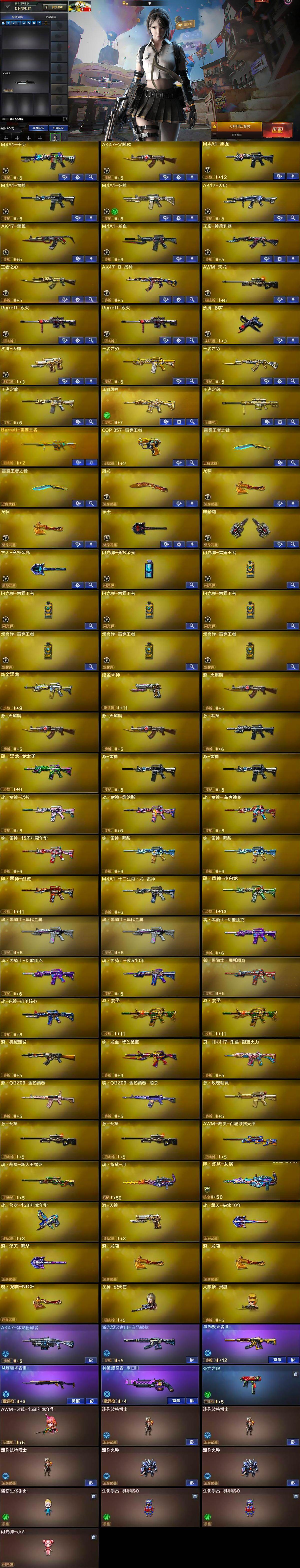 【英雄级武器】:M4A1-千变,AK47-火麒麟,M4A1-黑龙,M4A1-雷神,M4A1-死神,AK12-天启,AK47-黑鲨,M4A1-龙血,无影-神兵利器,王者之心-觉醒版,AK47-B-战神,AWM-天龙,Barrett-毁灭*2,沙鹰-修罗,沙鹰-天神,屠龙,龙啸*2,擎天,麒麟刺,擎天-竞技荣光,闪光弹-竞技荣光,闪光弹-雷霆王者-觉醒版*4,烟雾弹-雷霆王者-觉醒版*3