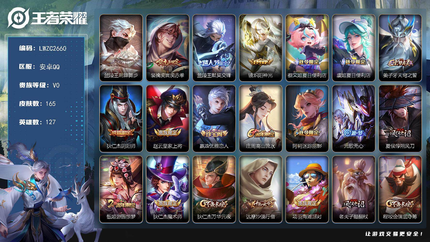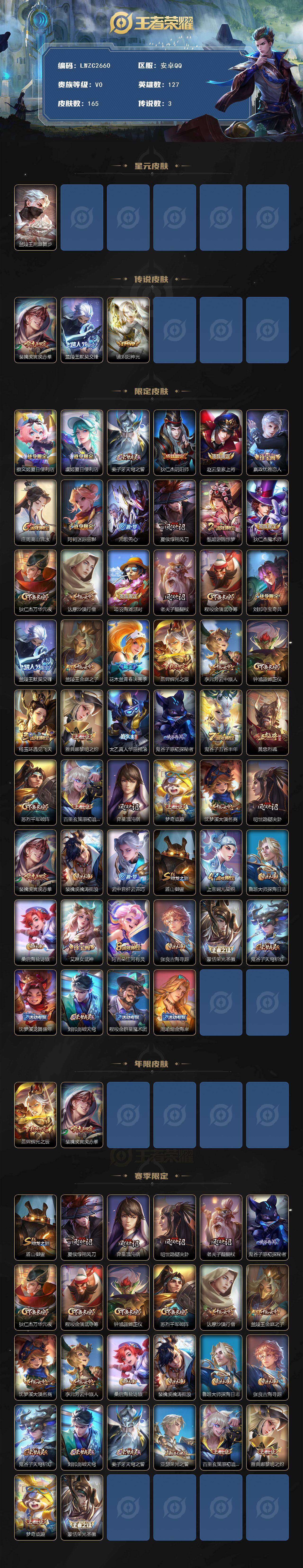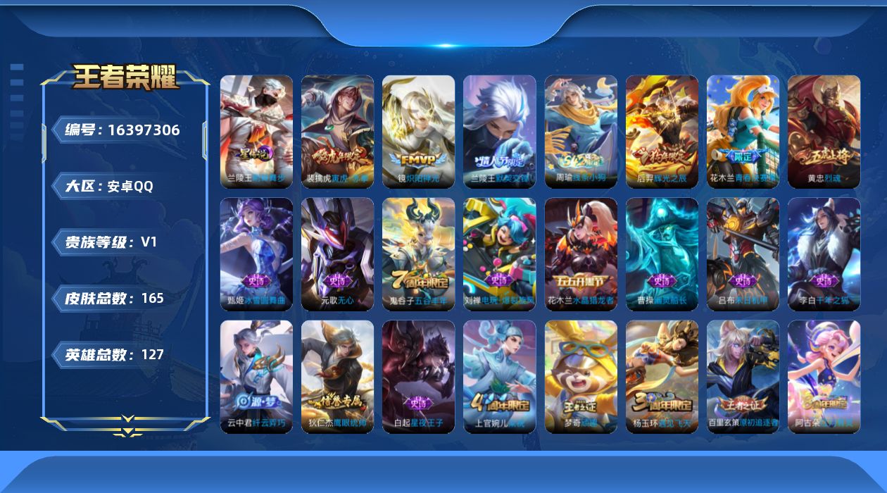 [16397306]【特价急出/详情看图】安卓Q-V0-最强王者段位-127英雄-165皮肤-1星元-3传说-40史诗