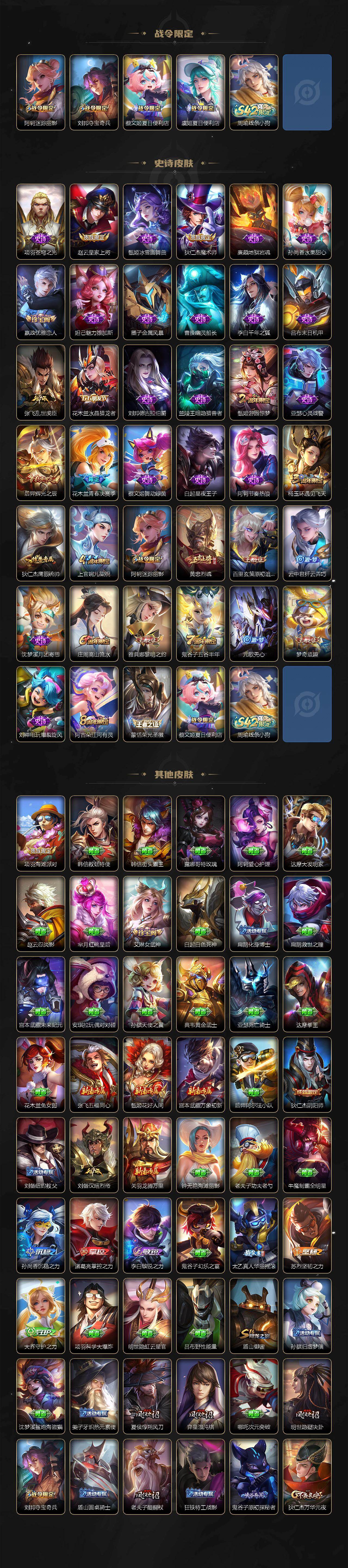 【史诗皮肤】:项羽苍穹之光,赵云皇家上将,甄姬冰雪圆舞曲,狄仁杰魔术师,廉颇地狱岩魂,孙尚香水果甜心,嬴政优雅恋人,妲己魅力维加斯,墨子金属风暴,曹操幽灵船长,李白千年之狐,吕布末日机甲,张飞乱世虎臣,花木兰水晶猎龙者,刘邦德古拉伯爵,兰陵王暗隐猎兽者,甄姬游园惊梦,亚瑟心灵战警,后羿辉光之辰,花木兰青春决赛季,蔡文姬舞动绿茵,白起星夜王子,阿轲节奏热浪,杨玉环遇见飞天,狄仁杰鹰眼统帅,上官婉儿梁祝,阿轲迷踪丽影,黄忠烈魂,百里玄策原初追逐者,云中君纤云弄巧,沈梦溪月团寄思,庄周高山流水,雅典娜黎明之约,鬼谷子五谷