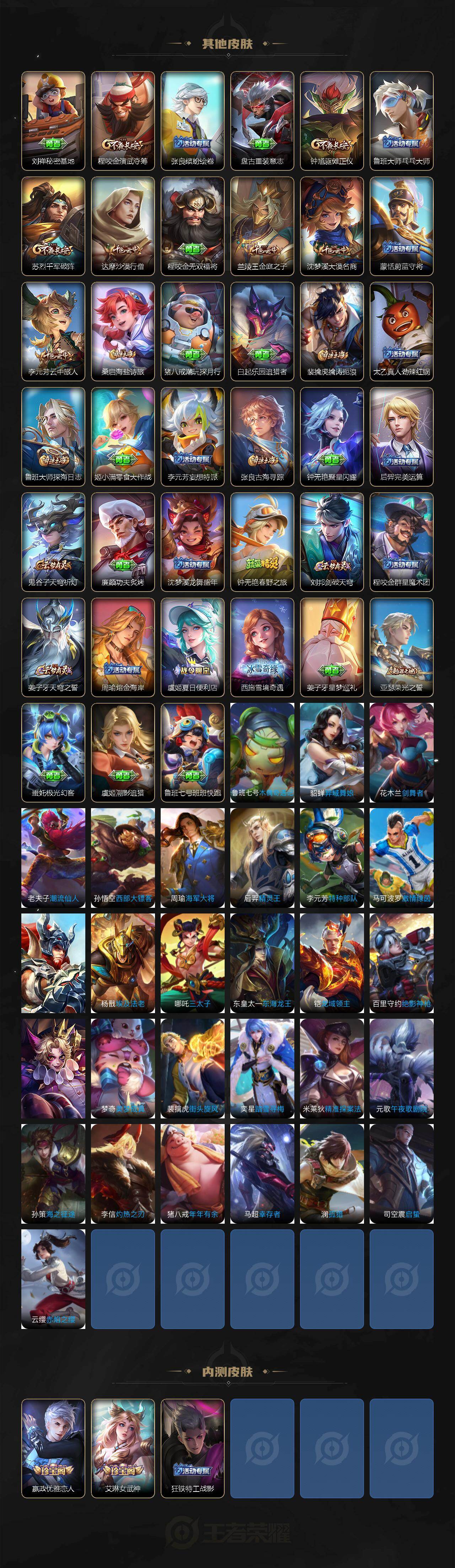 【赛季限定】:盾山御銮,夏侯惇朔风刀,弈星混沌棋,明世隐疑决卦,老夫子醍醐杖,鬼谷子原初探秘者,狄仁杰万华元夜,程咬金演武夺筹,钟馗驱傩正仪,苏烈千军破阵,达摩沙漠行僧,兰陵王金庭之子,沈梦溪大漠名商,李元芳云中旅人,桑启海盐诗旅,裴擒虎擒涛扼浪,鲁班大师探海日志,张良古海寻踪,鬼谷子天穹祈灯,刘邦剑破天穹,姜子牙天穹之誓,亚瑟荣光之誓,百里玄策原初追逐者,雅典娜黎明之约,梦奇顽趣,蒙恬荣光圣徽