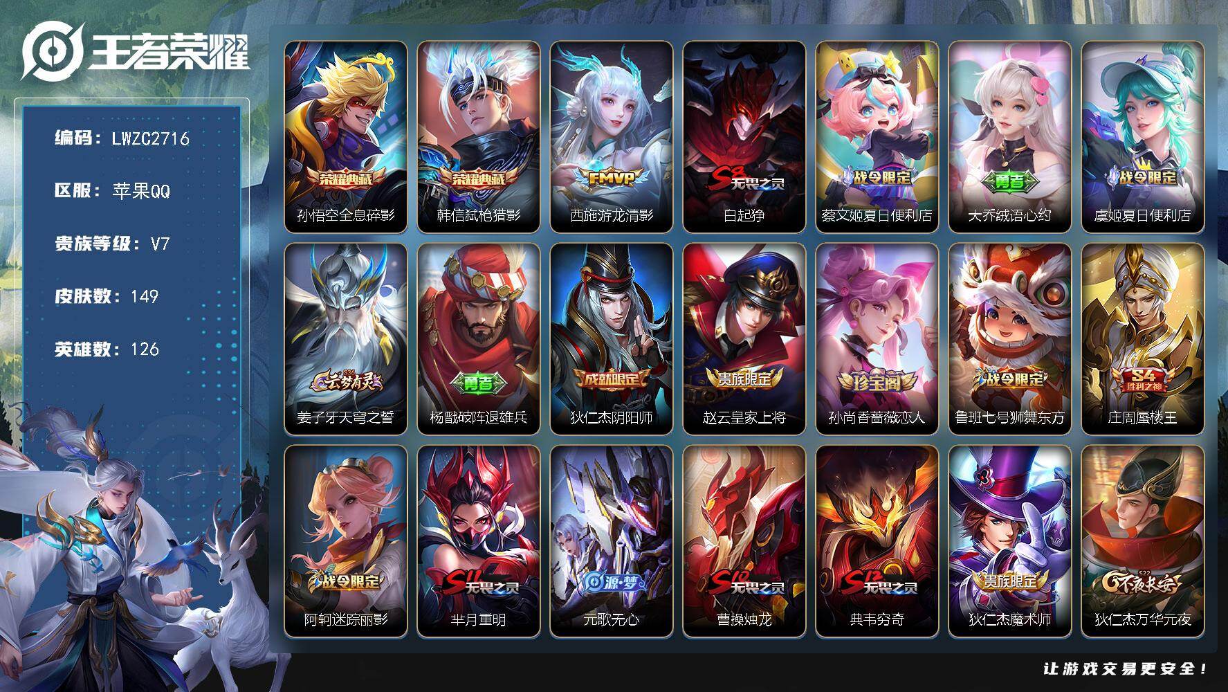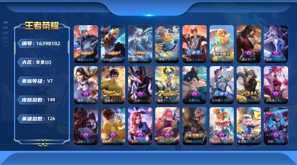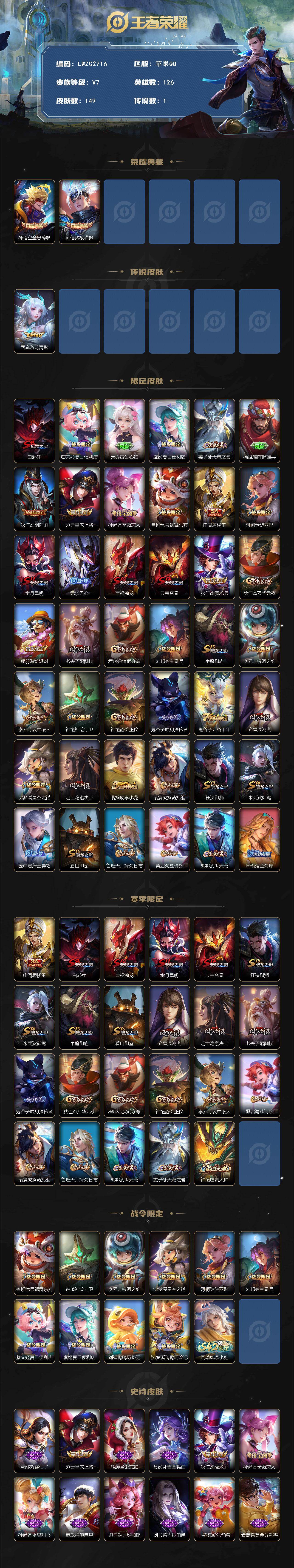 [16398102]可二次【特价出售/店主推荐安卓】苹果Q-V7-最强王者段位-126英雄-149皮肤-2典藏皮肤-1传说-30史诗