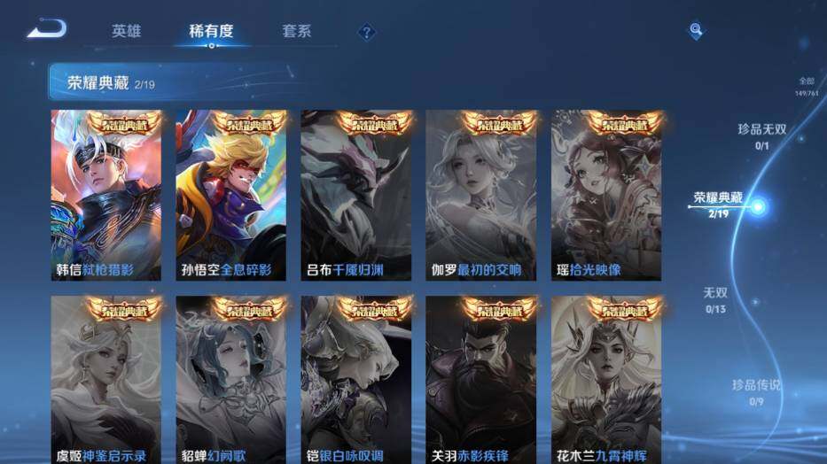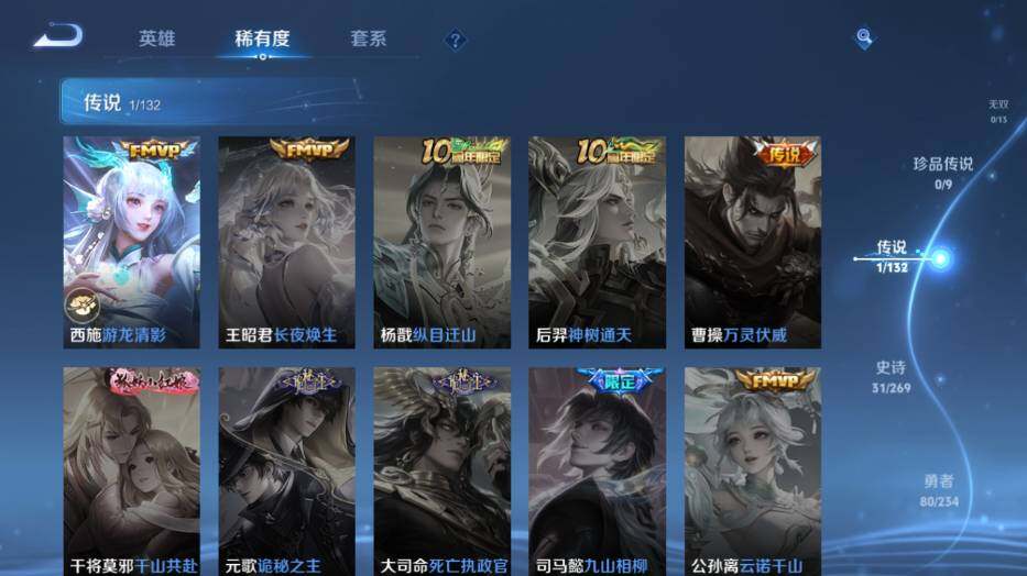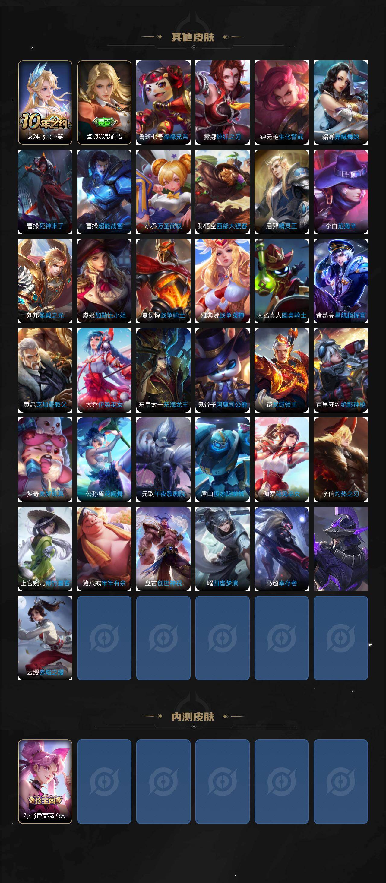 【赛季限定】:庄周蜃楼王,白起狰,曹操烛龙,芈月重明,典韦穷奇,狂铁御狮,米莱狄御霄,牛魔御旌,盾山御銮,弈星混沌棋,明世隐疑决卦,老夫子醍醐杖,鬼谷子原初探秘者,狄仁杰万华元夜,程咬金演武夺筹,钟馗驱傩正仪,李元芳云中旅人,桑启海盐诗旅,裴擒虎擒涛扼浪,鲁班大师探海日志,刘邦剑破天穹,姜子牙天穹之誓,钟馗虚灵犬护