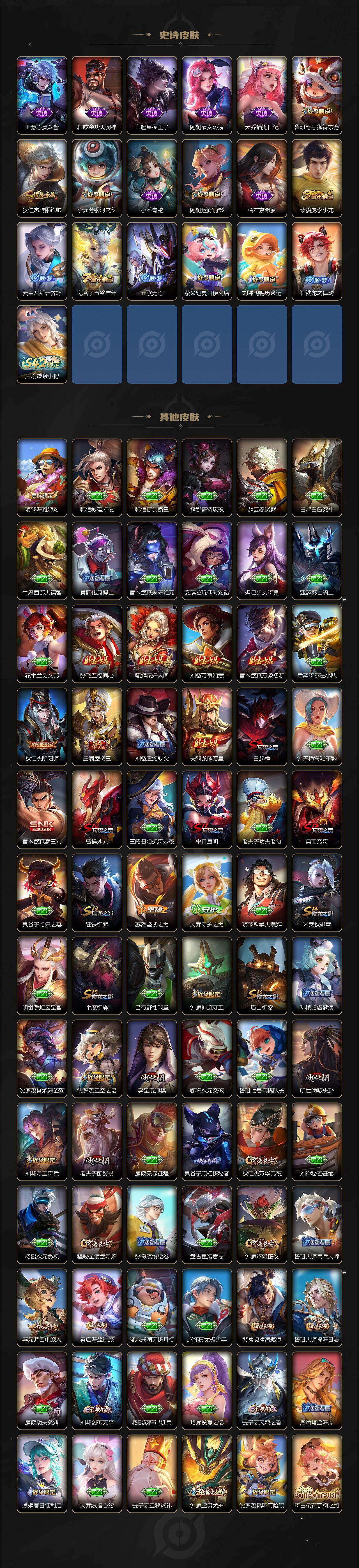 【史诗皮肤】:露娜紫霞仙子,赵云皇家上将,貂蝉圣诞恋歌,甄姬冰雪圆舞曲,狄仁杰魔术师,孙尚香蔷薇恋人,孙尚香水果甜心,嬴政摇滚巨星,妲己魅力维加斯,刘邦德古拉伯爵,小乔缤纷独角兽,诸葛亮黄金分割率,亚瑟心灵战警,程咬金功夫厨神,白起星夜王子,阿轲节奏热浪,大乔猫狗日记,鲁班七号狮舞东方,狄仁杰鹰眼统帅,李元芳银河之约,小乔青蛇,阿轲迷踪丽影,橘右京修罗,裴擒虎李小龙,云中君纤云弄巧,鬼谷子五谷丰年,元歌无心,蔡文姬夏日便利店,刘禅鸭鸭历险记,狂铁龙之律动,周瑜线条小狗