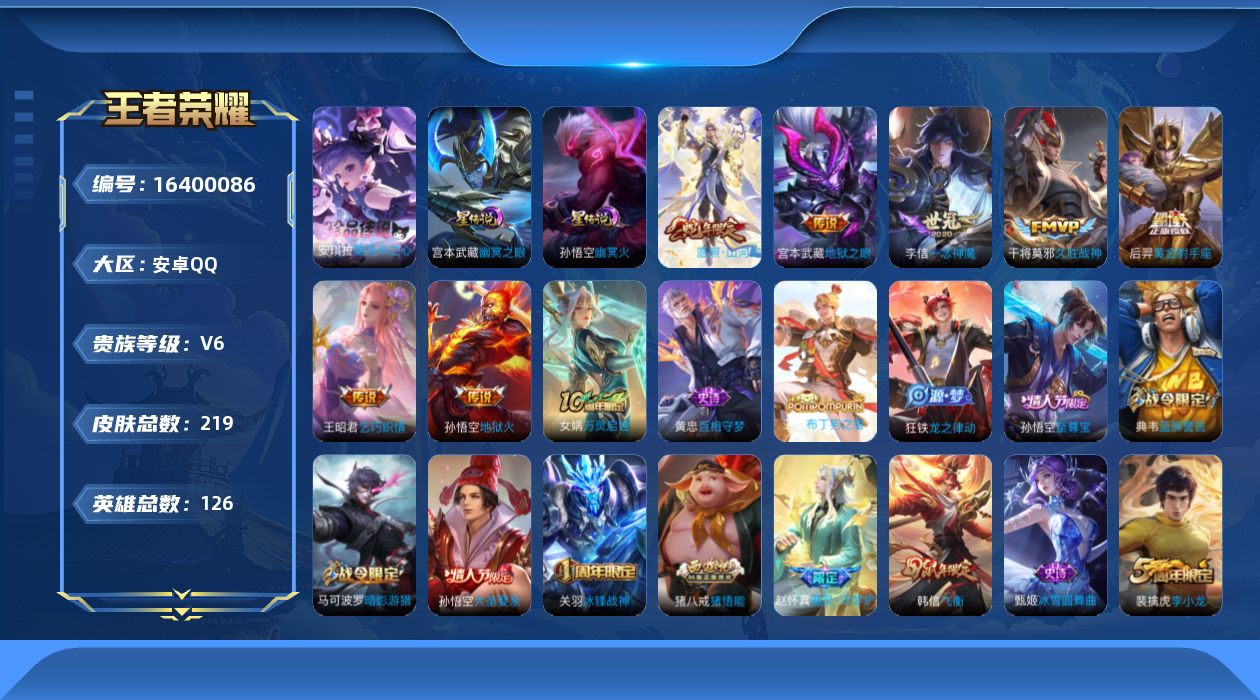 [16400086]【特价急出/详情看图】安卓Q-V6-最强王者段位-126英雄-219皮肤-1珍品传说-2星元-7传说-52史诗