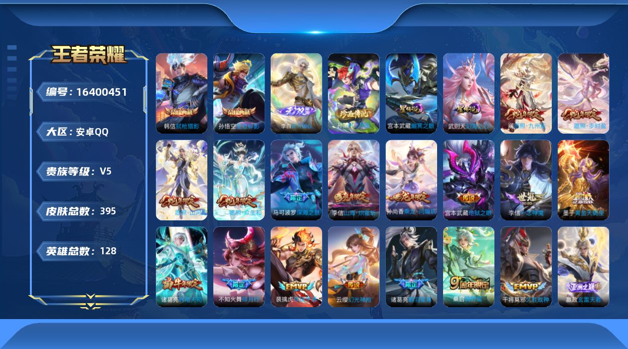[16400451]可二次【特价出售/店主推荐】安卓Q-V8-最强王者段位-128英雄-395皮肤-2典藏皮肤-1典藏英雄-1无双-1珍品传说-2星传说-22传说-128史诗