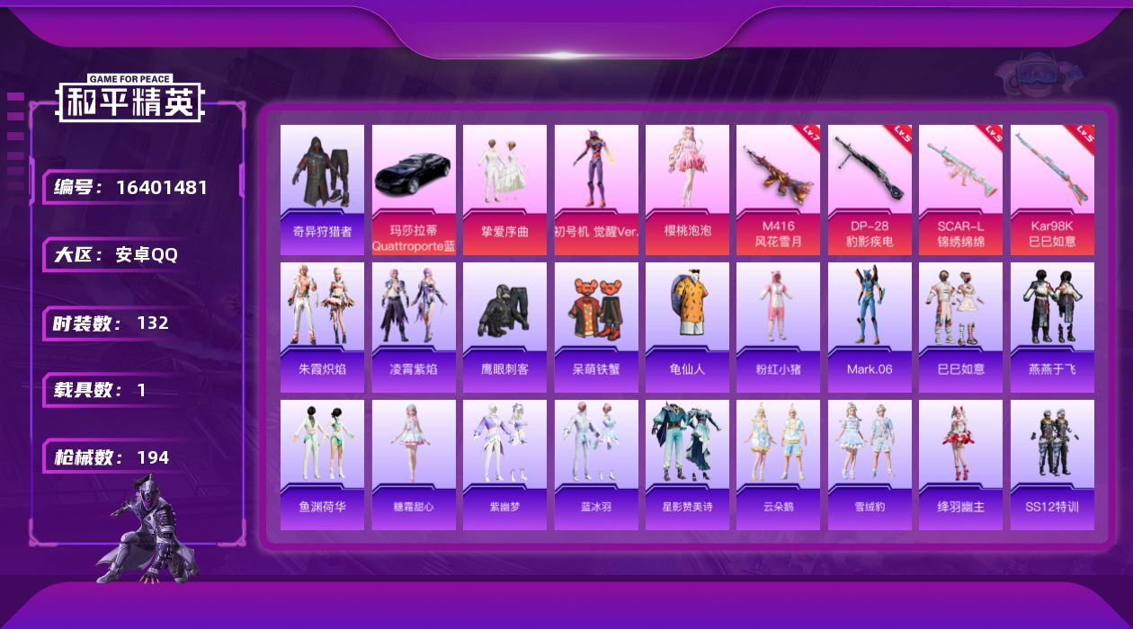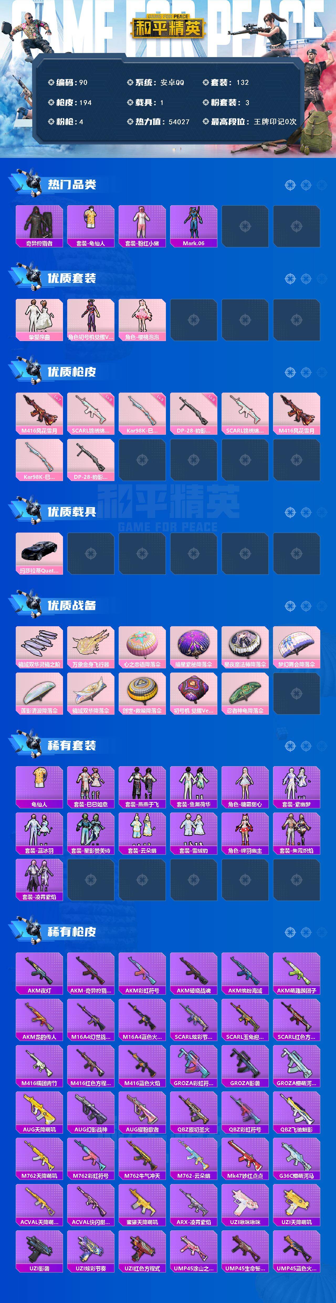 [16401481]安卓 手Q-3粉装-4特效枪-1载具-3粉色飞行器-54027热力值-1王牌印记-132套装-194枪皮 【热门品类】:套装-奇异狩猎者,套装-龟仙人,套装-粉红小猪,角色-Mark.06 【粉色套装】:粉装-挚爱序曲,角色-初号机 觉醒Ver.,角色-樱桃泡泡 【粉色枪皮等级】:SCAR-L-锦绣绵绵(五级),M416-风花雪月(七级),Kar98K-巳巳如意(五级),DP-28-豹影疾电(五级) 【粉色载具】:玛莎拉蒂Quattroporte(夜幕蓝) 【粉色枪皮】:SCAR-L-锦绣绵绵,M416-风花雪月,Kar98K-巳巳如意,DP-28-豹影疾电 【粉色飞行器】:镜域双华-灵镜之阶,万象金身飞行器 【粉色降落伞】:心之恋语降落伞,暗星紫秘降落伞,星夜魔法师降落伞,梦幻舞会降落伞,莲影清波降落伞,镜域双华降落伞,创世·救赎降落伞,初号机 觉醒Ver.降落伞,忍者神龟降落伞 【稀有套装】:套装-龟仙人,套装-巳巳如意,套装-燕燕于飞,套装-鱼渊荷华,角色-糖霜甜心,套装-紫幽梦,套装-蓝冰羽,套装-星影赞美诗,套装-云朵鹅,套装-雪绒豹,角色-绛羽幽主,套装-朱霞炽焰,套装-凌霄紫焰 【稀有枪皮】:AKM-夜灯,AKM-奇异狩猎者,AKM-彩虹符号,AKM-破晓战魂,AKM-缤纷海域,AKM-萌趣颜团子,AKM-龙的传人,M16A4-幻世战舞者,M16A4-蓝色火焰,SCAR-L-炫彩节奏,SCAR-L-玉兔迎春,SCAR-L-红色方程式,M416-糯团青竹,M416-红色方程式,M416-蓝色火焰,GROZA-彩虹符号,GROZA-影袭,GROZA-懵萌河马,AUG-天降萌叽,AUG-幻影战神,AUG-耀粉歌者,QBZ-原初圣火,QBZ-彩虹符号,QBZ-飞驰魅影,M762-天降萌叽,M762-彩虹符号,M762-牛气冲天,M762-云朵鹅,Mk47-妙红点点,G36C-懵萌河马,AC-VAL-天降萌叽,AC-VAL-快闪甜心,蜜獾-天降萌叽,ARX-凌霄紫焰,UZI-啾咪啾咪,UZI-天降萌叽,UZI-影袭,UZI-炫彩节奏,UZI-红色方程式,UMP45-涂山之恋,UMP45-生命誓言,UMP45-蓝色火焰,Vector-焰鹰斗篷,Vector-夜灯,Vector-彩虹符号,汤姆逊-天降萌叽,汤姆逊-暗夜鎏金,汤姆逊-炫彩节奏,汤姆逊-耀粉歌者,JS