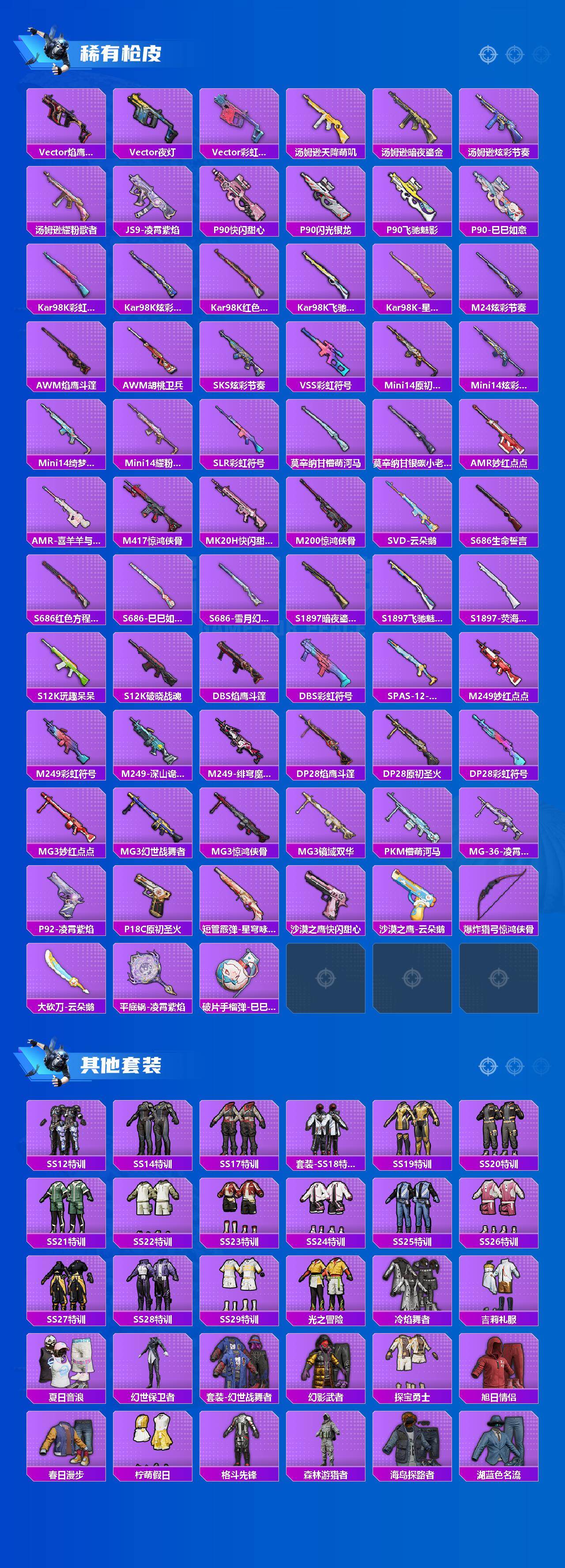 【稀有枪皮】:AKM-夜灯,AKM-奇异狩猎者,AKM-彩虹符号,AKM-破晓战魂,AKM-缤纷海域,AKM-萌趣颜团子,AKM-龙的传人,M16A4-幻世战舞者,M16A4-蓝色火焰,SCAR-L-炫彩节奏,SCAR-L-玉兔迎春,SCAR-L-红色方程式,M416-糯团青竹,M416-红色方程式,M416-蓝色火焰,GROZA-彩虹符号,GROZA-影袭,GROZA-懵萌河马,AUG-天降萌叽,AUG-幻影战神,AUG-耀粉歌者,QBZ-原初圣火,QBZ-彩虹符号,QBZ-飞驰魅影,M762-天降萌叽,M762-彩虹符号,M762-牛气冲天,M762-云朵鹅,Mk47-妙红点点,G36C-懵萌河马,AC-VAL-天降萌叽,AC-VAL-快闪甜心,蜜獾-天降萌叽,ARX-凌霄紫焰,UZI-啾咪啾咪,UZI-天降萌叽,UZI-影袭,UZI-炫彩节奏,UZI-红色方程式,UMP45-涂山之恋,UMP45-生命誓言,UMP45-蓝色火焰,Vector-焰鹰斗篷,Vector-夜灯,Vector-彩虹符号,汤姆逊-天降萌叽,汤姆逊-暗夜鎏金,汤姆逊-炫彩节奏,汤姆逊-耀粉歌者,JS
