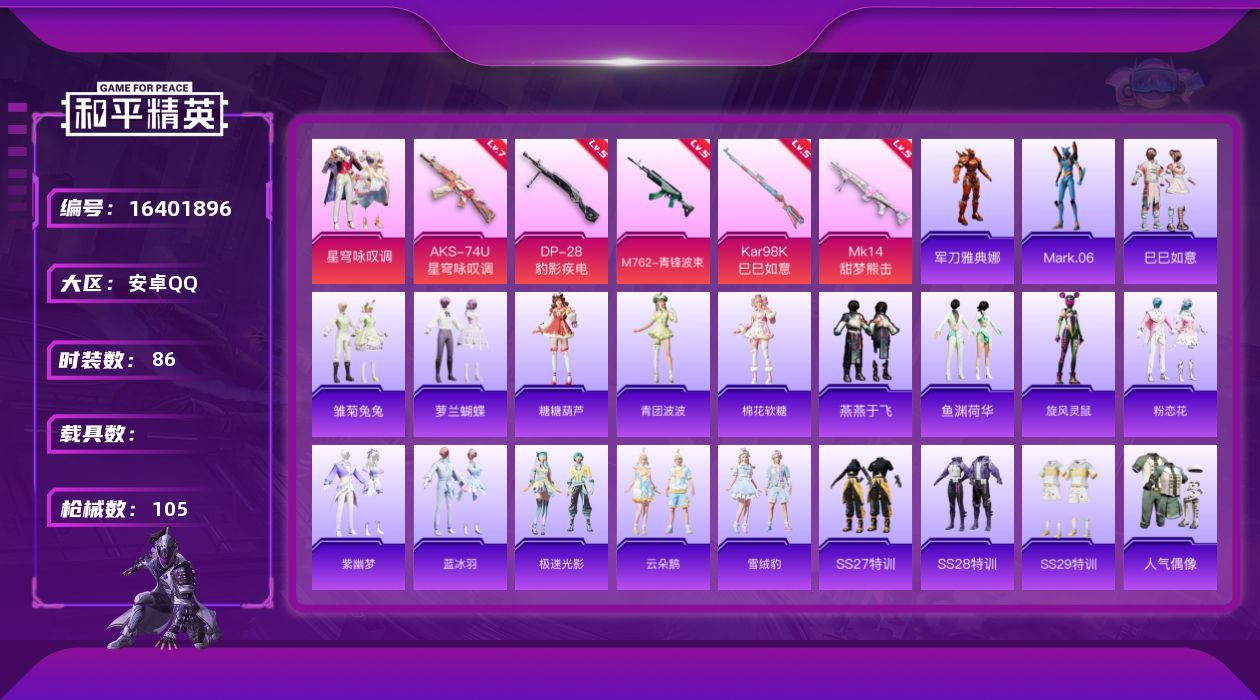- PX_2081118- 安卓手Q-17王牌印记-5粉装-5特效枪-1载具-77645热力值-178套装-260枪皮-1卓越印记-0传奇印记 【5粉装】,宝贝奶油派,放客神游,洛天依,星穹咏叹调,樱桃泡泡 【5特效枪】AKM-绿萝繁花-5级 SCAR-L-机甲封神-7级 M416-心之恋语-7级 Kar98K-巳巳如意-5级 AMR-智耀战神-7级 【5稀有紫装】,奇异狩猎者,暗影哥特,浪漫天命,