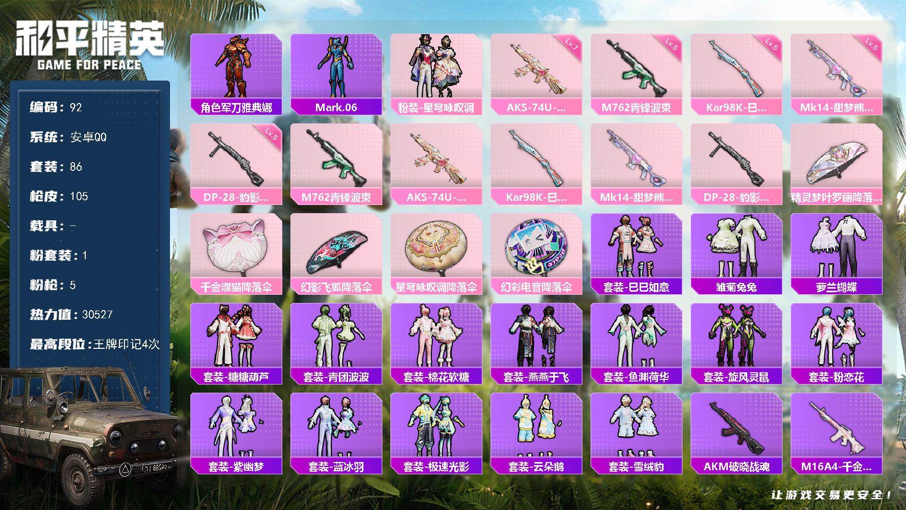 [16401896]安卓 手Q-1粉装-5特效枪-0载具-1粉色飞行器-30527热力值-4王牌印记-86套装-105枪皮