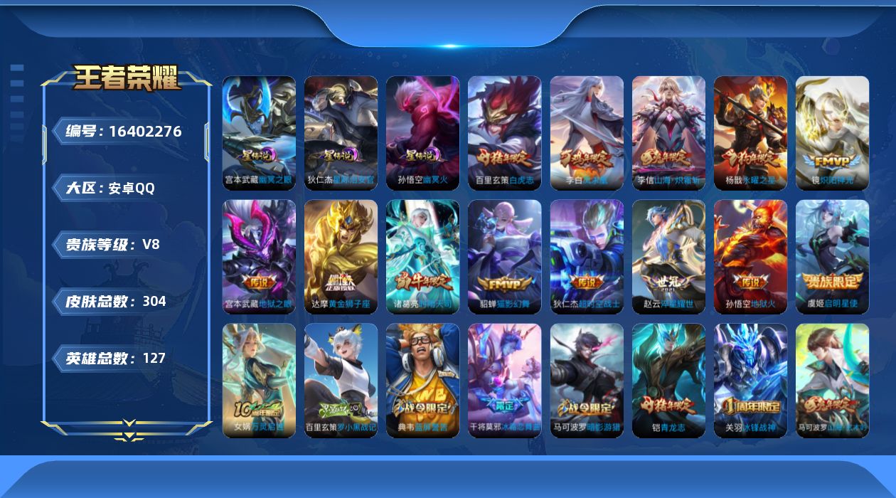 [16402276]【特价出售/店主推荐/1省标/11市标】:安卓Q-V8-尊贵铂金I段位-127英雄-304皮肤-1典藏英雄-3星元-14传说-77史诗