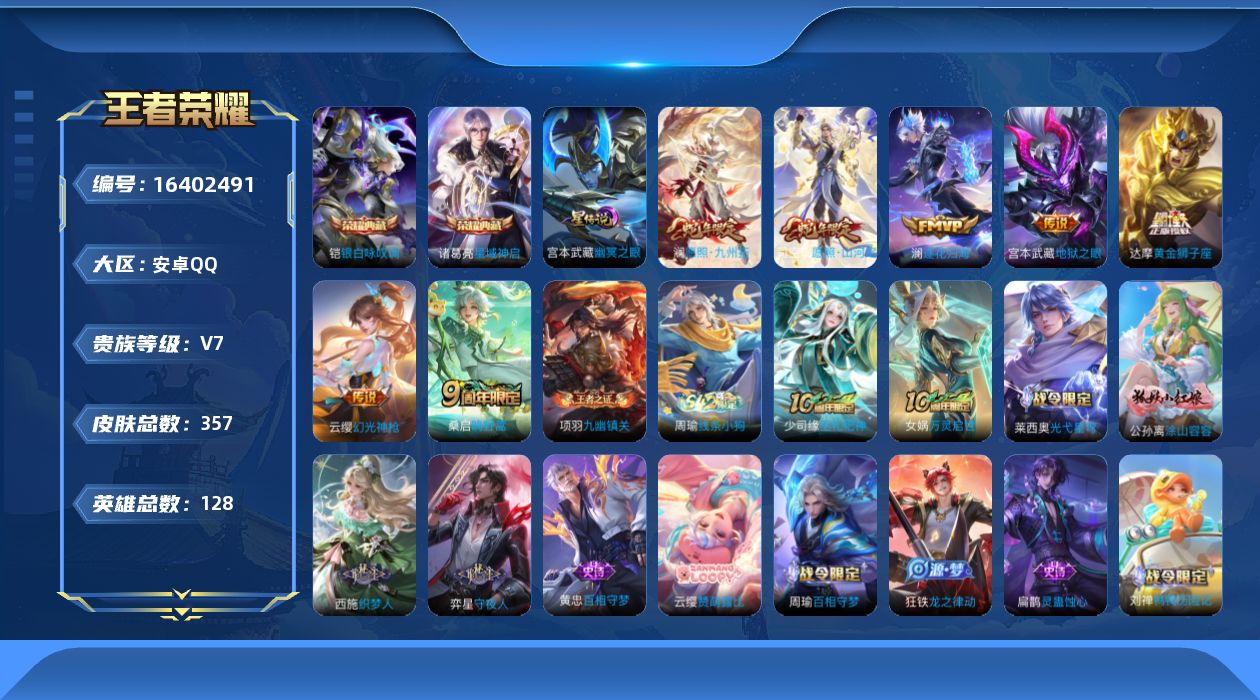[16402491]【店主推荐捡漏号!可直接换绑 打野33段 发育路32段 1省标 4市标】安卓Q-V7-最强王者段位-127英雄-351皮肤-2典藏皮肤-8传说-1星传说-103史诗 【英雄全皮】:孙权全皮,钟馗全皮,蒙恬全皮,司空震全皮,戈娅全皮,空空儿全皮,影全皮 【荣耀典藏】:诸葛亮星域神启,铠银白咏叹调 【传说皮肤】:后羿神树通天,司空震愿照山河定,澜愿照九州拓,云缨幻光神枪,桑启鸣野蒿,澜逐花归海,达摩黄金狮子座,宫本武藏地狱之眼 【限定皮肤】:暃埋骨钱,蔡文姬夏日便利店,大乔绒语心约,虞姬夏日便利店,姜子牙天穹之誓,李白谪仙醉月,狄仁杰阴阳师,赵云皇家上将,赵云百木心枪,孙尚香蔷薇恋人,庄周玄嵩,高渐离玩趣恶龙,阿轲迷踪丽影,钟无艳超时空战士,芈月幻夜卜梦,元歌无心,甄姬落雪兰心,马可波罗山海玄木吟,狄仁杰魔术师,达摩沙漠行僧,项羽海滩派对,程咬金演武夺筹,韩信飞衡,韩信傲雪梅枪,兰陵王金庭之子,孙悟空孙行者,李元芳云中旅人,钟馗神迹守卫,钟馗驱傩正仪,杨戬潮玩骑兵,雅典娜黎明之约,鬼谷子五谷丰年,黄忠火炮绅士,苏烈千军破阵,百里玄策原初追逐者,弈星混沌棋,梦奇顽趣,沈梦溪大漠名商,明世隐疑决卦,裴擒虎李小龙,裴擒虎擒涛扼浪,狂铁电玩高手,米莱狄胡桃异想国,云中君纤云弄巧,云中君时之祈愿,上官婉儿梁祝,嫦娥拒霜思,嫦娥暖冬兔眠,西施玲珑珍味,鲁班大师探海日志,桑启海盐诗旅,暃星界游侠,戈娅驭风魔法,艾琳流音漫舞,司空震地狱燃心,阿古朵江河有灵,张良古海寻踪,蒙犽百解令,蒙恬荣光圣徽,高渐离燃音魔法,妲己灵卜魔法,鬼谷子天穹祈灯,伽罗琥珀纪元,姬小满妄想食味,沈梦溪龙舞盛年,刘邦剑破天穹,程咬金群星魔术团,镜青焰无极,项羽苍威无极,刘备异域游侠,周瑜熔金海岸 【年限皮肤】:韩信飞衡,庄周玄嵩,马超神威,马可波罗山海玄木吟 【赛季限定】:达摩沙漠行僧,程咬金演武夺筹,兰陵王金庭之子,张良古海寻踪,李元芳云中旅人,钟馗驱傩正仪,雅典娜黎明之约,苏烈千军破阵,百里玄策原初追逐者,弈星混沌棋,梦奇顽趣,沈梦溪大漠名商,明世隐疑决卦,裴擒虎擒涛扼浪,鲁班大师探海日志,桑启海盐诗旅,鬼谷子天穹祈灯,蒙恬荣光圣徽,刘邦剑破天穹,姜子牙天穹之誓 【战令限定】:蔡文姬夏日便利店,虞姬夏日便利店,阿轲迷踪丽影,钟无艳超时空战士,芈月幻夜卜梦,甄姬落雪兰心,艾琳流音漫舞,钟馗神迹守卫,杨戬潮
