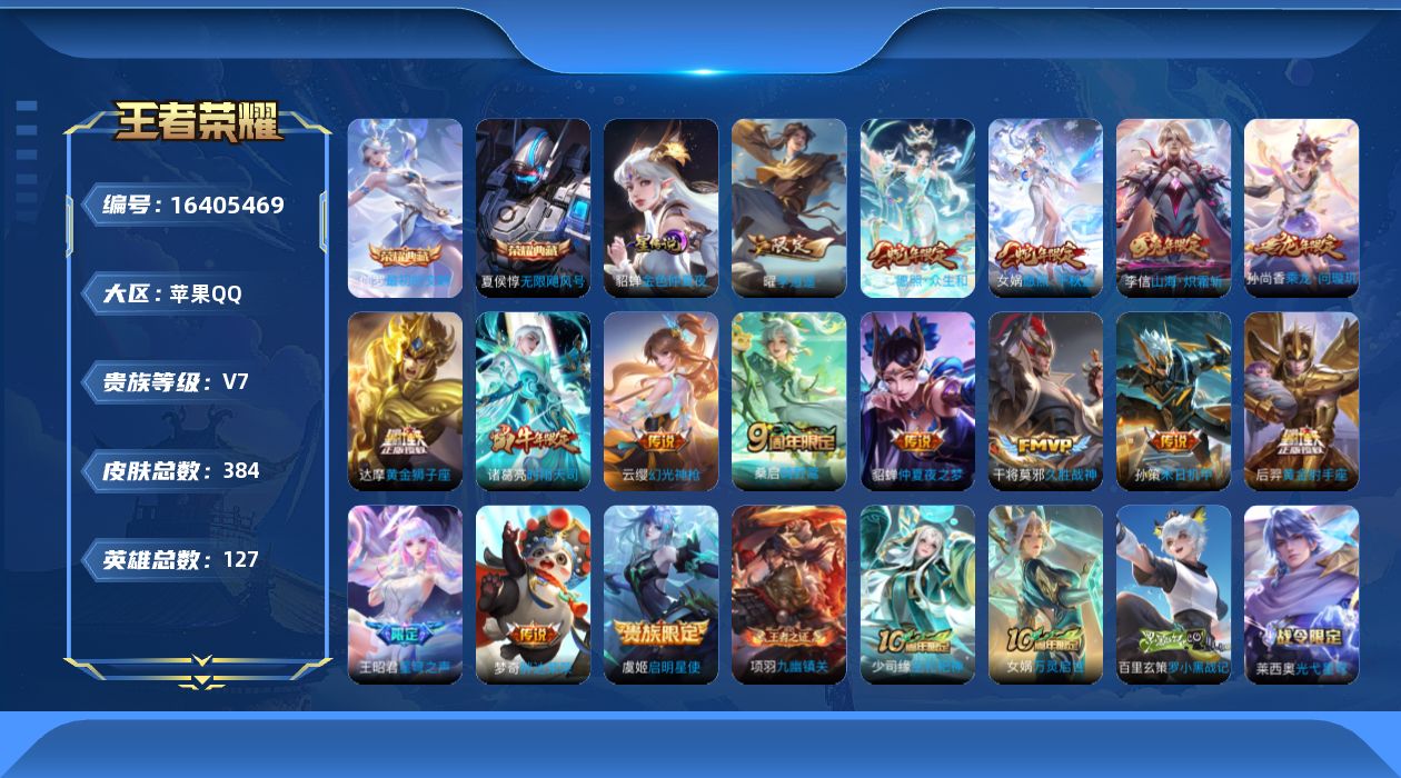 [16405469]【特价出售/店主推荐】苹果Q-V7-永恒钻石II段位-127英雄-384皮肤-2典藏皮肤-1星传说-16传说-128史诗