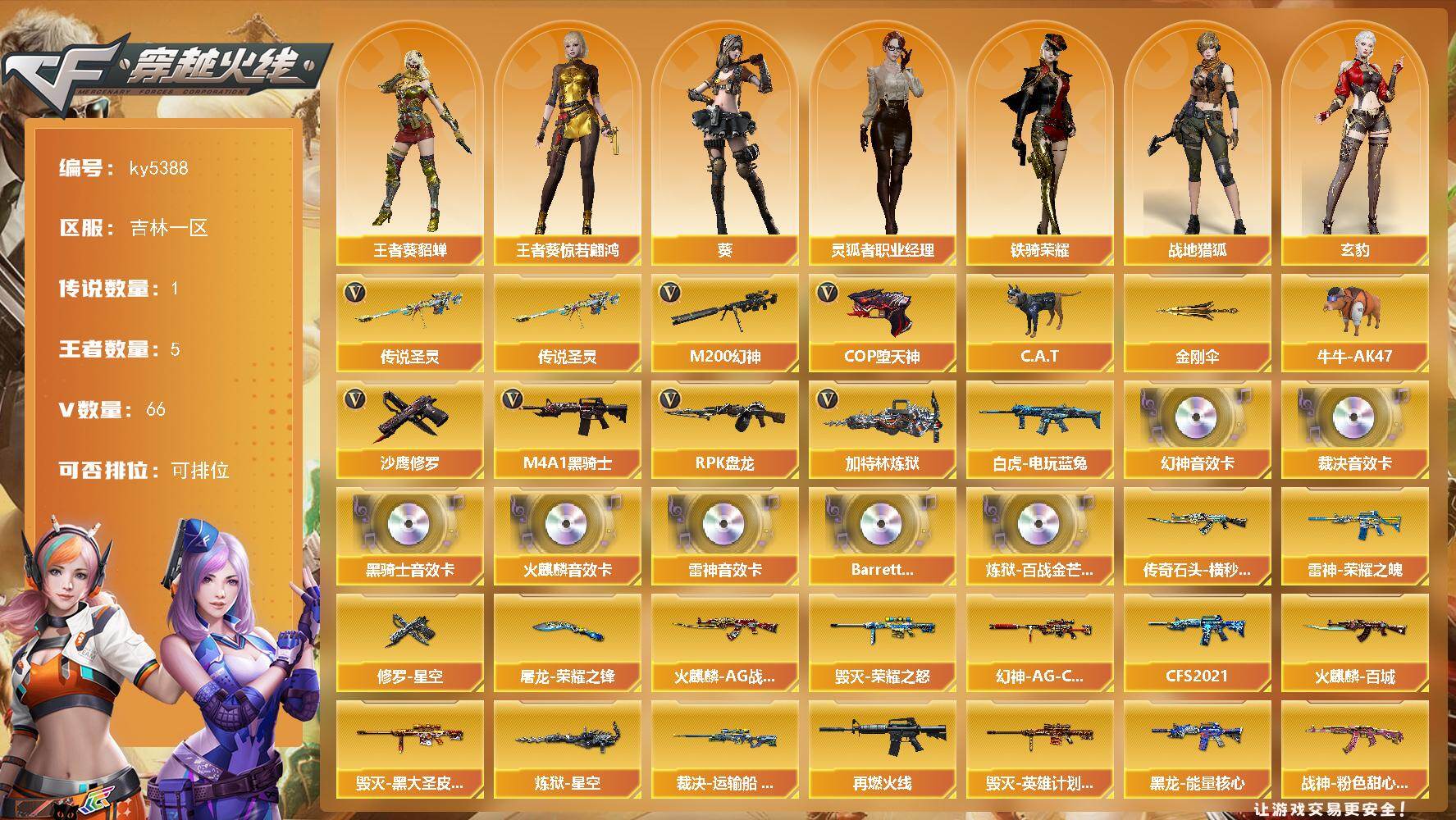 [16404563]吉林一区-72V-5王者武器数-0炫金武器数 【传说武器】:传说圣灵 【热门武器】:传说圣灵,M200-幻神,白虎-电玩蓝兔,C.A.T,牛牛-AK47,M4A1-黑骑士,RPK-盘龙,加特林-炼狱,COP-堕天神,沙鹰-修罗,金刚伞 【音效卡】:M200-幻神音效卡,AK47-火麒麟音效卡,M4A1-雷神音效卡,M4A1-黑骑士音效卡,AWM-裁决音效卡,Barrett-碧霄极光音效卡*3,炼狱-百战金芒-庆典舞曲音效卡 【皮肤】:幻神-AG-CFPLS17冠军,裁决-运输船 皮肤,裁决-胜者为王 皮肤,雷神-荣耀之魄,M4A1-再燃火线,火麒麟-AG战队皮肤,传奇石头-横秒之巅,火麒麟-百城,毁灭-荣耀之怒,毁灭-黑大圣皮肤,毁灭-英雄计划 皮肤,黑龙-能量核心,黑骑士-CFS2021,战神-粉色甜心皮肤*2,AK47-B-常胜将军-曹操*2,AK47-B-常胜将军-刘备,炼狱-星空,修罗-星空,屠龙-荣耀之锋,屠龙-惊鸿 皮肤,轻型军用手斧-再燃火线 【角色】:葵,玄豹,战地猎狐,王者-葵-貂蝉,王者葵-惊若翩鸿,奇洋探员,云海玲珑,暗夜-X,电竞少女,飞虎队-X,虎妞,娟娟,灵狐者-X,灵狐者-七夕宝贝,灵狐者-职业经理,龙儿,龙儿-小淘气,曼陀罗-X,潘多拉-X,潘多拉-甜心教官,蛇姬,铁骑荣耀,樱-战斗天使,游珑儿 【人偶武器】:巴雷特-零-水下丽影,修罗-茸茸松狮,COP-旗袍,C.A.T,牛牛-AK47,迷你裂空之翼,闪光弹-貂蝉,高爆手雷-大乔,迷你超能女侍 【暴走生化】:超级对讲机 【英雄级武器】:AK47-火麒麟,M4A1-雷神,M4A1-黑骑士,M4A1-堕天神,黑武士-锦绣游龙,AK-47-猩红传说*2,王者火魄-觉醒版,AK47-B-常胜将军,QBZ-03-王者蔷薇-觉醒版,白虎-电玩蓝兔,王者玄武-觉醒版,Barrett-毁灭,Barrett-极光,AWM-裁决,M200-幻神,RPK-盘龙,加特林-炼狱,炼狱-百战金芒,沙鹰-修罗,沙鹰-天神*3,COP-堕天神,屠龙,龙啸,麒麟刺-堕天神,龙啸-堕天神*3,麒麟刺-百战金芒,王者之锋-觉醒版,丛林匕首-玄豹*2,高爆手雷-堕天神*7,高爆手雷-竞技荣光,手雷-热带奇洋,闪光弹-堕天神*6,闪光弹-竞技荣光,闪光弹-玄豹*3,烟雾弹-堕天神*6,烟雾弹-竞技荣光,烟雾弹-玄豹*2,M