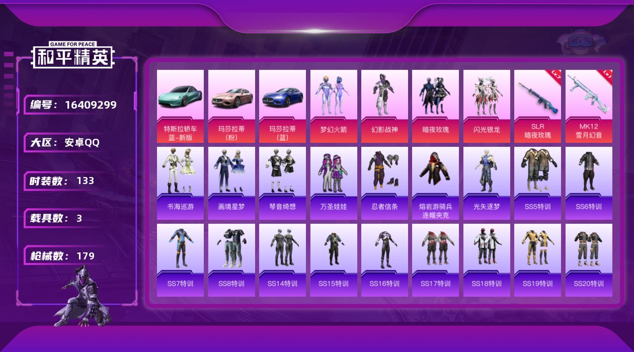[16409299]【店主推荐捡漏号!可直接换绑】安卓 手Q-4粉装-2特效枪-3载具-2粉色飞行器-54727热力值-5王牌印记-133套装-179枪皮【热门品类】:粉装-梦幻火箭,套装-忍者信条,熔岩游骑兵连帽夹克【粉色套装】:粉装-幻影战神,粉装-梦幻火箭,粉装-暗夜玫瑰,粉装-闪光银龙【粉色枪皮等级】:SLR-暗夜玫瑰(七级),MK12-雪月幻音(一级)【粉色载具】:特斯拉Roadster(水滴蓝),玛莎拉蒂Ghibli(粉),玛莎拉蒂Ghibli(蓝)【粉色枪皮】:SLR-暗夜玫瑰,MK12-雪月幻音【粉色飞行器】:天之羽翼飞行器,闪光银龙飞行器