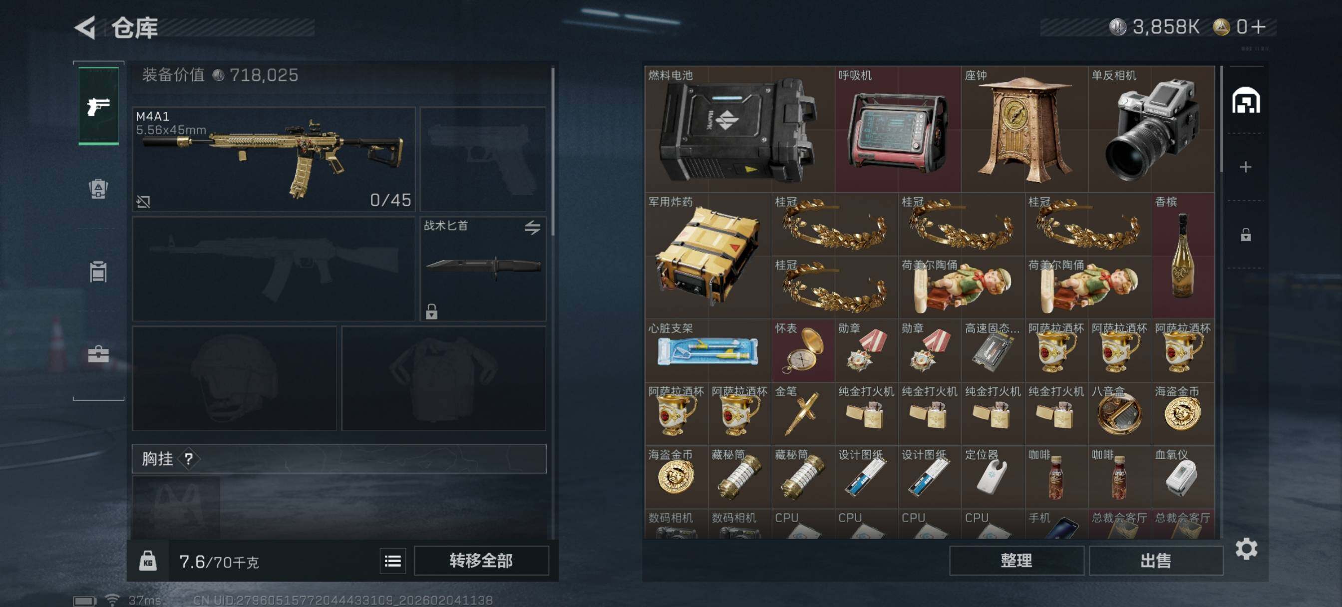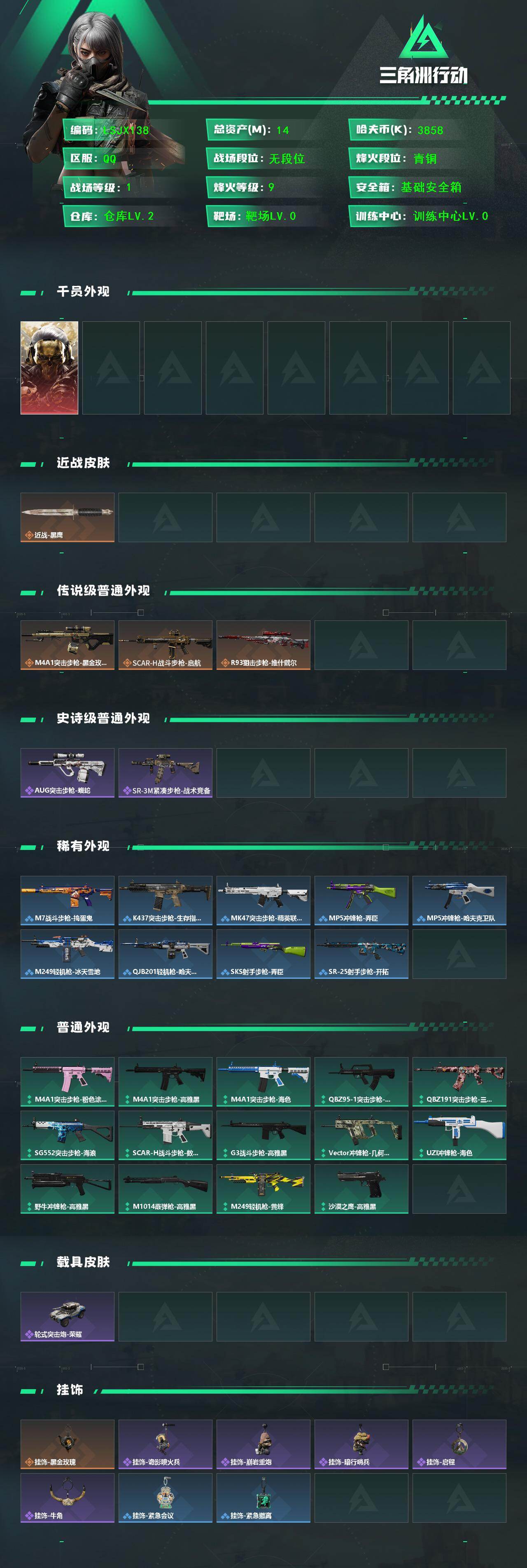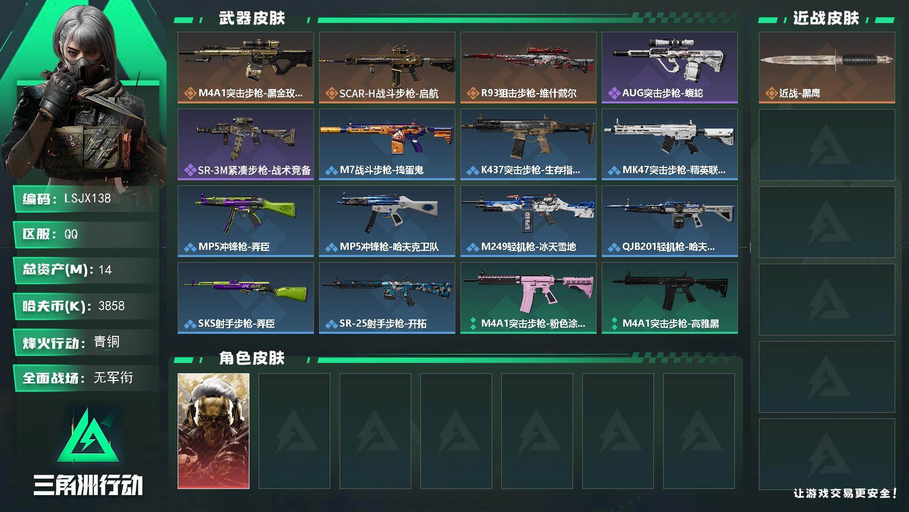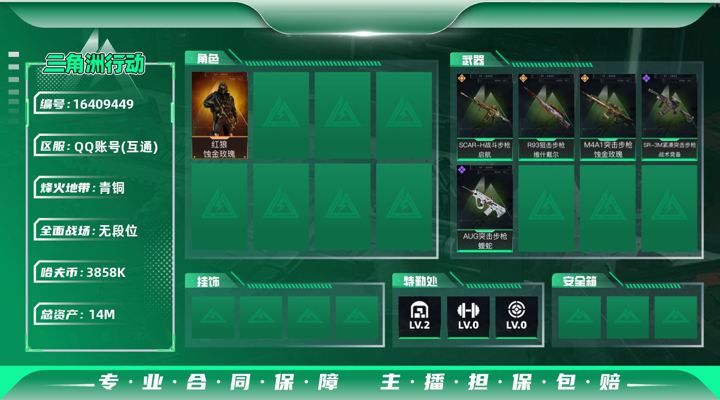 [16409449]【特价出售/店主推荐】14m总资产-3858k哈伏币-9烽火等级-青铜-1战场等级-无军衔 【干员外观】:红狼-蚀金玫瑰 【近战皮肤】:近战-黑鹰 【传说外观】:M4A1突击步枪-蚀金玫瑰,SCAR-H战斗步枪-启航,R93狙击步枪-维什戴尔 【史诗外观】:AUG突击步枪-蝮蛇,SR-3M紧凑突击步枪-战术竞备 【稀有外观】:M7战斗步枪-捣蛋鬼,K437突击步枪-生存指令,MK47突击步枪-精英联盟,MP5冲锋枪-弄臣,MP5冲锋枪-哈夫克卫队,M249轻机枪-冰天雪地,QJB201轻机枪-哈夫克卫队,SKS射手步枪-弄臣,SR-25射手步枪-开拓 【普通外观】:M4A1突击步枪-粉色涂装,M4A1突击步枪-高雅黑,M4A1突击步枪-海色,QBZ95-1突击步枪-高雅黑,QBZ95-1突击步枪-2026,QBZ191突击步枪-三角洲力量,SG552突击步枪-海浪,SCAR-H战斗步枪-数码迷彩,G3战斗步枪-高雅黑,Vector冲锋枪-几何迷彩,UZI冲锋枪-海色,野牛冲锋枪-高雅黑,M1014霰弹枪-高雅黑,M249轻机枪-黄蜂,沙漠之鹰-高雅黑 【载具外观】:轮式突击炮-荣耀 【挂饰】:挂饰-蚀金玫瑰,挂饰-诡影喷火兵*6,挂饰-崩岩重炮*2,挂饰-暗行哨兵*6,挂饰-启程,挂饰-牛角,挂饰-紧急会议*4,挂饰-紧急撤离*17