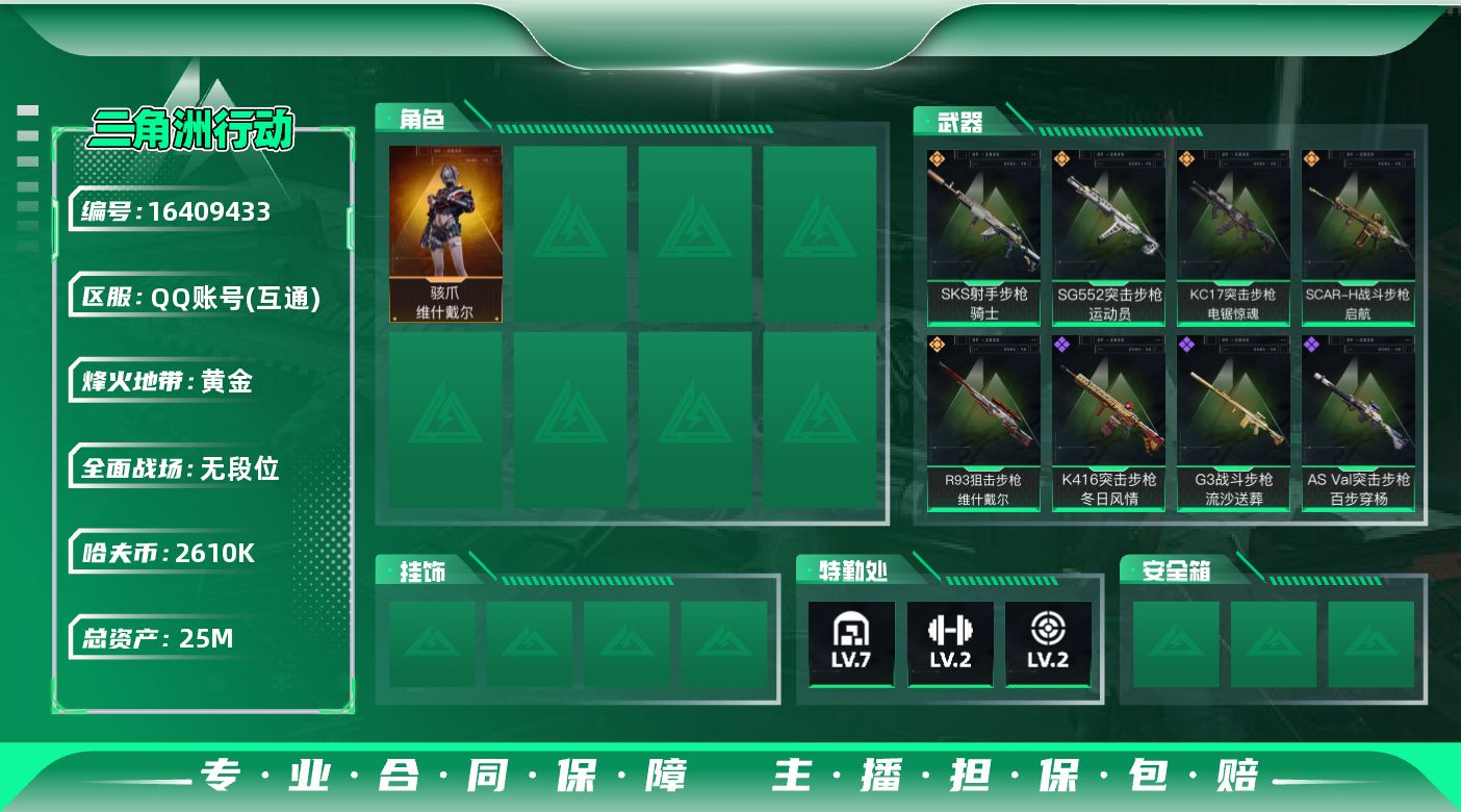 [16409433]【特价出售/店主推荐】25m总资产-2610k哈伏币-44烽火等级-黄金-5战场等级-无军衔 【干员外观】:骇爪-维什戴尔 【近战皮肤】:近战-黑鹰 【传说外观】:SG552突击步枪-运动员,SCAR-H战斗步枪-启航,KC17突击步枪-电锯惊魂,SKS射手步枪-骑士,R93狙击步枪-维什戴尔 【史诗外观】:K416突击步枪-冬日风情,G3战斗步枪-流沙送葬,AS Val突击步枪-百步穿杨,Vector冲锋枪-猎鳄行动,Vector冲锋枪-百步穿杨,M700狙击步枪-百步穿杨,AWM狙击步枪-流沙送葬 【稀有外观】:M4A1突击步枪-繁盛,AKM突击步枪-肃杀,ASh-12战斗步枪-繁盛,M7战斗步枪-捣蛋鬼,G3战斗步枪-主宰,腾龙突击步枪-冰天雪地,K437突击步枪-生存指令,MK47突击步枪-精英联盟,Vector冲锋枪-先锋,SMG-45-行动开启,SMG-45冲锋枪-幻影结构,勇士冲锋枪-主宰,Mini-14射手步枪-荣耀列队,PSG-1射手步枪-主宰,SV-98狙击步枪-星链科技,SV-98狙击步枪-哈夫克航天,SV-98狙击步枪-精英联盟,G18-星链科技,G18-哈夫克航天 【普通外观】:M4A1突击步枪-粉色涂装,M4A1突击步枪-高雅黑,QBZ95-1突击步枪-海浪,QBZ95-1突击步枪-2026,QBZ191突击步枪-三角洲力量,K416突击步枪-高雅黑,AUG突击步枪-浅蓝涂装,M7战斗步枪-红色涂装,SG552突击步枪-浅蓝涂装,SG552突击步枪-海浪,AK-12突击步枪-变色龙,CAR-15突击步枪-变色龙,K437突击步枪-磐石,AKS-74U突击步枪-磐石,MP5冲锋枪-海色,Vector冲锋枪-几何迷彩,UZI冲锋枪-海色,SR-3M紧凑突击步枪-变色龙,M1014霰弹枪-变色龙,M249轻机枪-黄蜂,QJB201轻机枪-磐石,SR9射手步枪-磐石,SV-98狙击步枪-红色涂装,R93狙击步枪-变色龙,沙漠之鹰-海浪,沙漠之鹰-高雅黑,G17-2026 【载具外观】:轮式突击炮-荣耀 【挂饰】:挂饰-维什戴尔,挂饰-诡影狙击兵*2,挂饰-诡影喷火兵*4,挂饰-崩岩重炮*8,挂饰-暗行哨兵*8,挂饰-启程,挂饰-雪人,挂饰-仪典匕首,挂饰-紧急撤离,挂饰-麻将*2