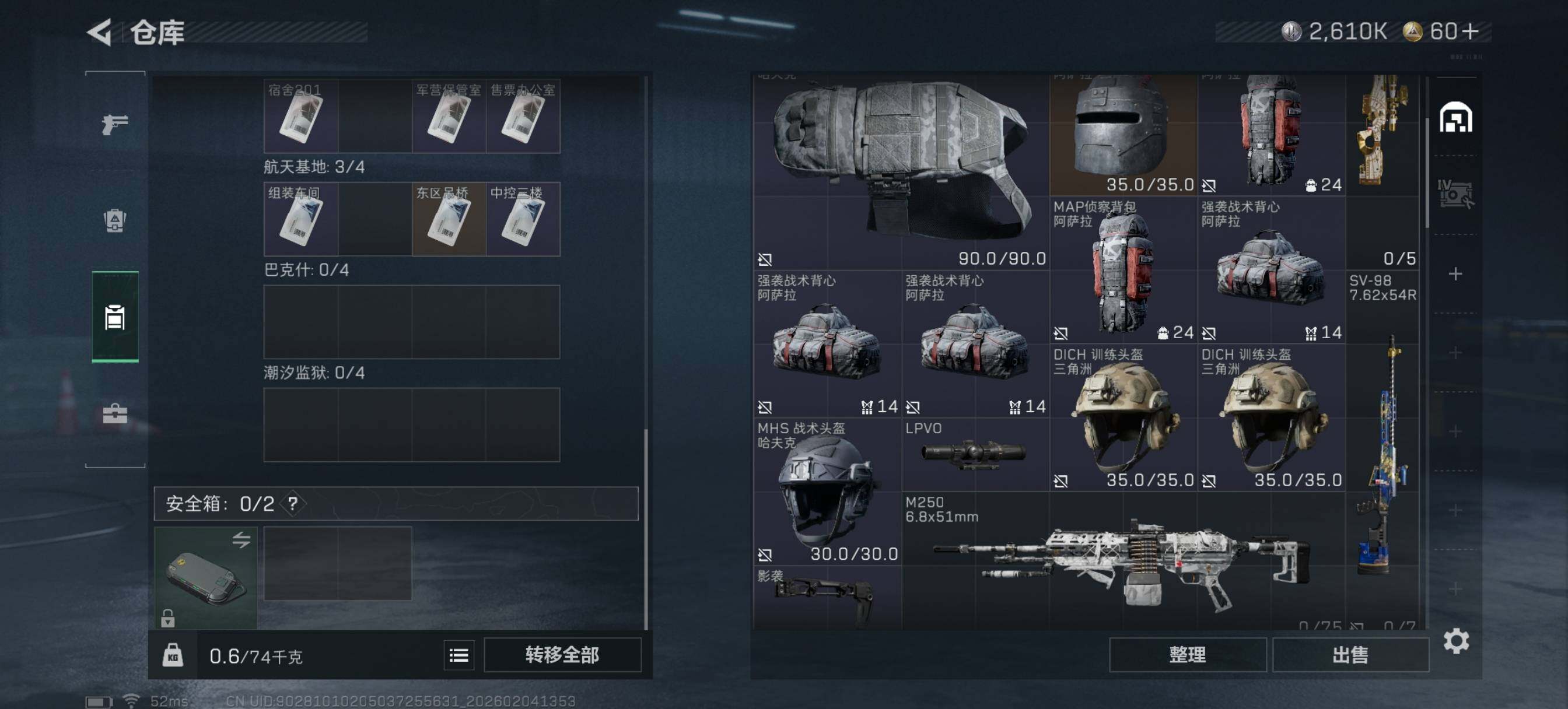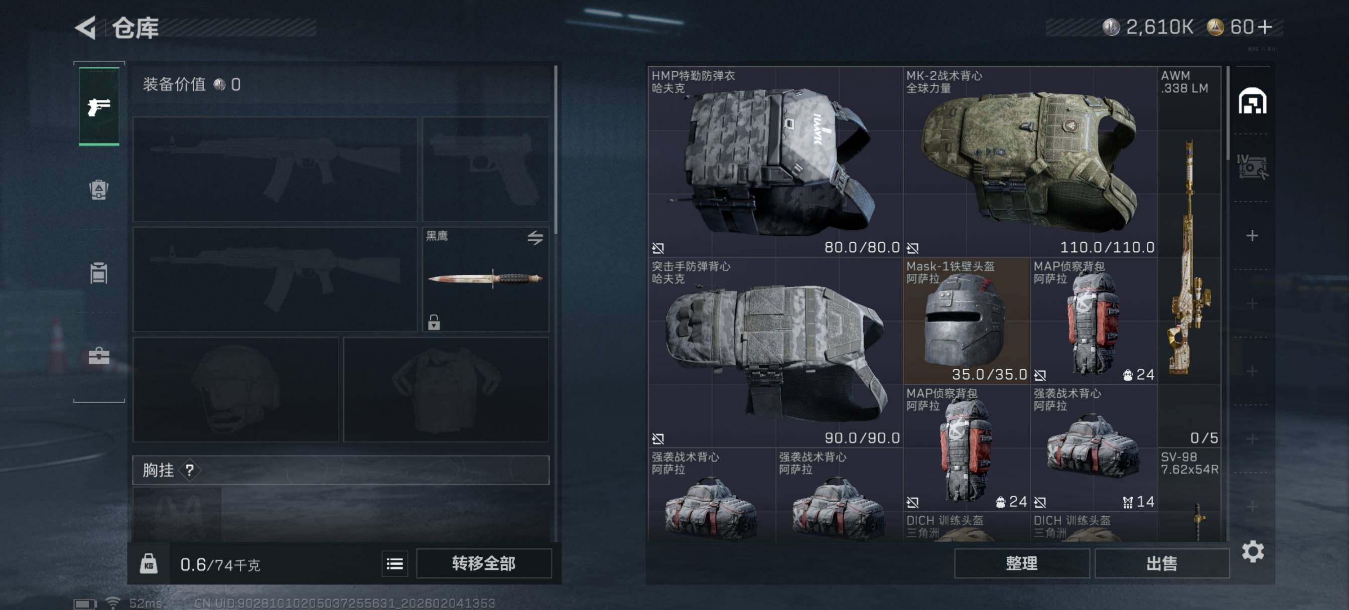 [16409434]【特价出售/店主推荐】25m总资产-2610k哈伏币-44烽火等级-黄金-5战场等级-无军衔 【干员外观】:骇爪-维什戴尔 【近战皮肤】:近战-黑鹰 【传说外观】:SG552突击步枪-运动员,SCAR-H战斗步枪-启航,KC17突击步枪-电锯惊魂,SKS射手步枪-骑士,R93狙击步枪-维什戴尔 【史诗外观】:K416突击步枪-冬日风情,G3战斗步枪-流沙送葬,AS Val突击步枪-百步穿杨,Vector冲锋枪-猎鳄行动,Vector冲锋枪-百步穿杨,M700狙击步枪-百步穿杨,AWM狙击步枪-流沙送葬 【稀有外观】:M4A1突击步枪-繁盛,AKM突击步枪-肃杀,ASh-12战斗步枪-繁盛,M7战斗步枪-捣蛋鬼,G3战斗步枪-主宰,腾龙突击步枪-冰天雪地,K437突击步枪-生存指令,MK47突击步枪-精英联盟,Vector冲锋枪-先锋,SMG-45-行动开启,SMG-45冲锋枪-幻影结构,勇士冲锋枪-主宰,Mini-14射手步枪-荣耀列队,PSG-1射手步枪-主宰,SV-98狙击步枪-星链科技,SV-98狙击步枪-哈夫克航天,SV-98狙击步枪-精英联盟,G18-星链科技,G18-哈夫克航天 【普通外观】:M4A1突击步枪-粉色涂装,M4A1突击步枪-高雅黑,QBZ95-1突击步枪-海浪,QBZ95-1突击步枪-2026,QBZ191突击步枪-三角洲力量,K416突击步枪-高雅黑,AUG突击步枪-浅蓝涂装,M7战斗步枪-红色涂装,SG552突击步枪-浅蓝涂装,SG552突击步枪-海浪,AK-12突击步枪-变色龙,CAR-15突击步枪-变色龙,K437突击步枪-磐石,AKS-74U突击步枪-磐石,MP5冲锋枪-海色,Vector冲锋枪-几何迷彩,UZI冲锋枪-海色,SR-3M紧凑突击步枪-变色龙,M1014霰弹枪-变色龙,M249轻机枪-黄蜂,QJB201轻机枪-磐石,SR9射手步枪-磐石,SV-98狙击步枪-红色涂装,R93狙击步枪-变色龙,沙漠之鹰-海浪,沙漠之鹰-高雅黑,G17-2026 【载具外观】:轮式突击炮-荣耀 【挂饰】:挂饰-维什戴尔,挂饰-诡影狙击兵*2,挂饰-诡影喷火兵*4,挂饰-崩岩重炮*8,挂饰-暗行哨兵*8,挂饰-启程,挂饰-雪人,挂饰-仪典匕首,挂饰-紧急撤离,挂饰-麻将*2