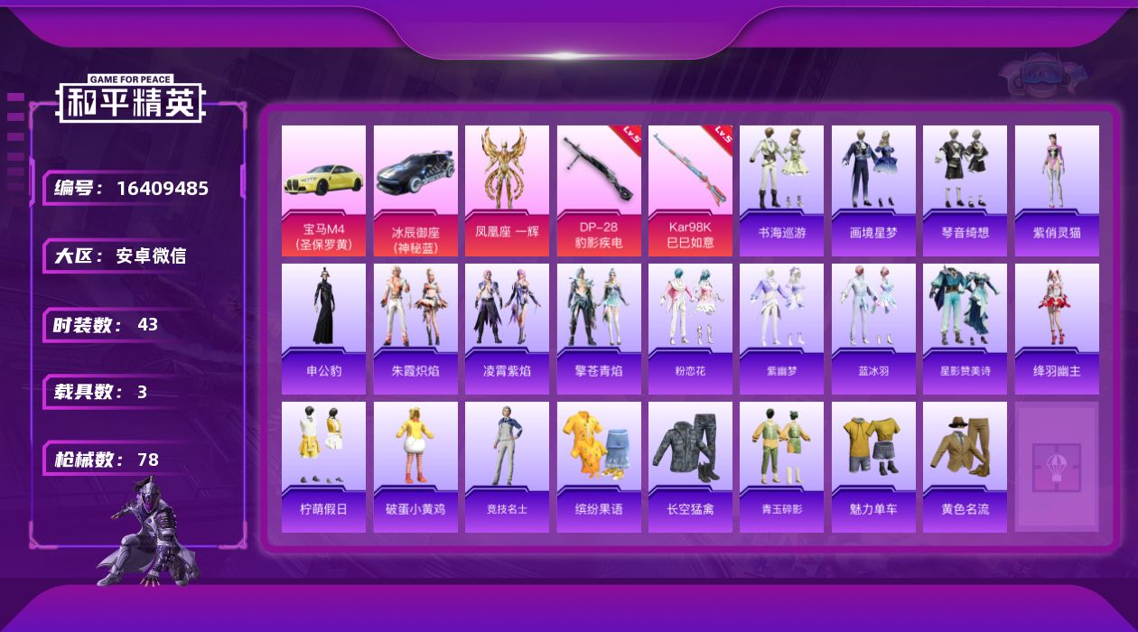[16409485]【特价出售/店主推荐】安卓 微信-1神装-2粉装-3特效枪-3载具-1粉色飞行器-27378热力值-6王牌印记-43套装-78枪皮 【红色神装等级】:暮色玫影-艾丽娅(二级) 【红色角色神装】:暮色玫影-艾丽娅 【粉色套装】:角色-凤凰座 一辉,角色-罪夜之冕 【粉色枪皮等级】:AKM-暮色玫影(三级),Kar98K-巳巳如意(五级),DP-28-豹影疾电(五级) 【粉色载具】:宝马M4(圣保罗黄),冰辰御座(神秘蓝),暮色幽蹄 【粉色枪皮】:AKM-暮色玫影,Kar98K-巳巳如意,DP-28-豹影疾电 【粉色飞行器】:暮色之舞飞行器 【粉色降落伞】:绝对恒星降落伞,千金淑猫降落伞,星穹咏叹调降落伞,霁蓝缠春降落伞,暮色玫影降落伞 【稀有套装】:套装-雪国风尚,套装-粉恋花,套装-紫幽梦,套装-蓝冰羽,套装-星影赞美诗,角色-绛羽幽主,套装-朱霞炽焰,套装-凌霄紫焰,套装-擎苍青焰,角色-申公豹,角色-紫俏灵猫,套装-书海巡游,套装-画境星梦,套装-琴音绮想 【稀有枪皮】:M416-蓝色火焰,GROZA-暮色玫影,AUG-耀粉歌者,AUG-绝对恒星,QBZ-彩虹符号,M762-彩虹符号,G36C-星穹咏叹调,蜜獾-天降萌叽,ACE32-画境星梦,ARX-凌霄紫焰,UZI-天降萌叽,UMP45-生命誓言,MP5K-画境星梦,JS9-凌霄紫焰,Kar98K-星穹咏叹调,AWM-暮色玫影,SKS-炫彩节奏,M1加兰德-画境星梦,S686-生命誓言,S686-千金淑猫,DBS-彩虹符号,AA12-G-画境星梦,DP-28-彩虹符号,MG3-幻世战舞者,MG-36-凌霄紫焰,P92-凌霄紫焰,短管霰弹-星穹咏叹调,蝎式手枪-千金淑猫,撬棍-暮色玫影,平底锅-凌霄紫焰,平底锅-画境星梦 【其他套装】:套装-柠萌假日,套装-破蛋小黄鸡,套装-竞技名士,套装-缤纷果语,套装-长空猛禽,套装-青玉碎影,套装-魅力单车,套装-黄色名流 【营地ID】:1030633590
