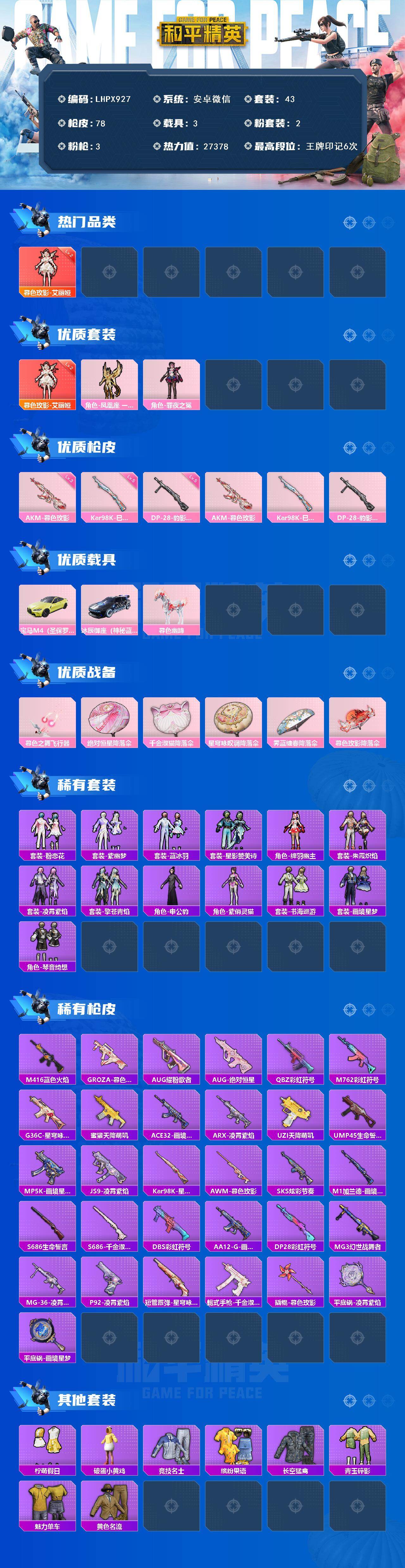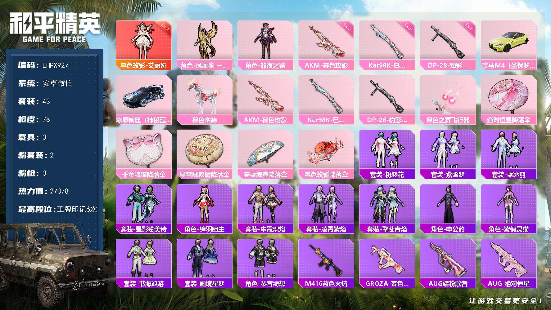 [16409485]【特价出售/店主推荐】安卓 微信-1神装-2粉装-3特效枪-3载具-1粉色飞行器-27378热力值-6王牌印记-43套装-78枪皮