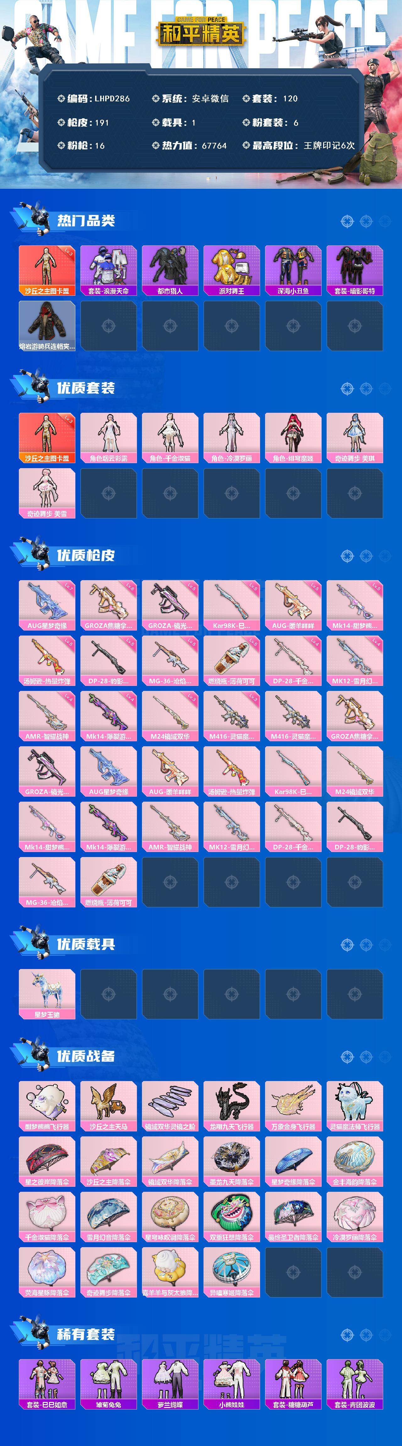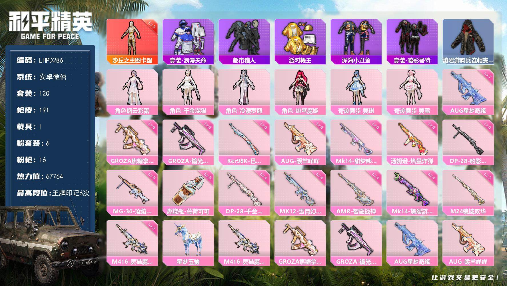 [16409649]【店主推荐捡漏号!可直接换绑】安卓 微信-1神装-6粉装-16特效枪-1载具-8粉色飞行器-6.7w热力值-6王牌印记-120套装-191枪皮