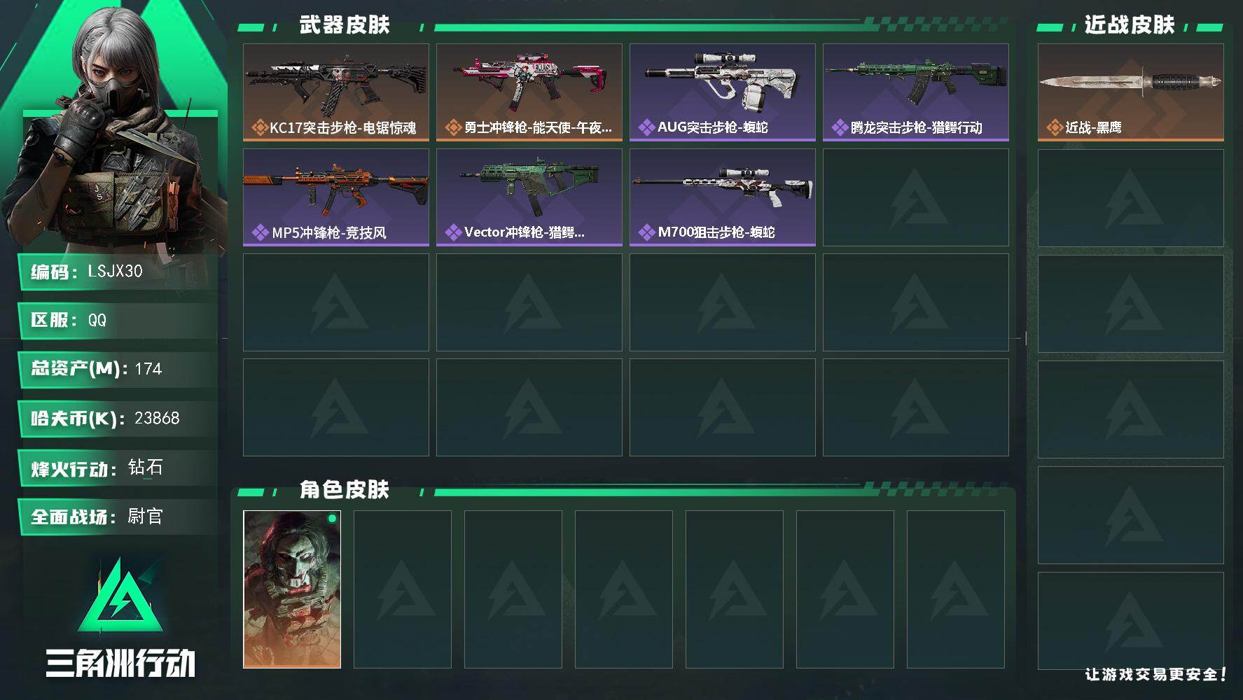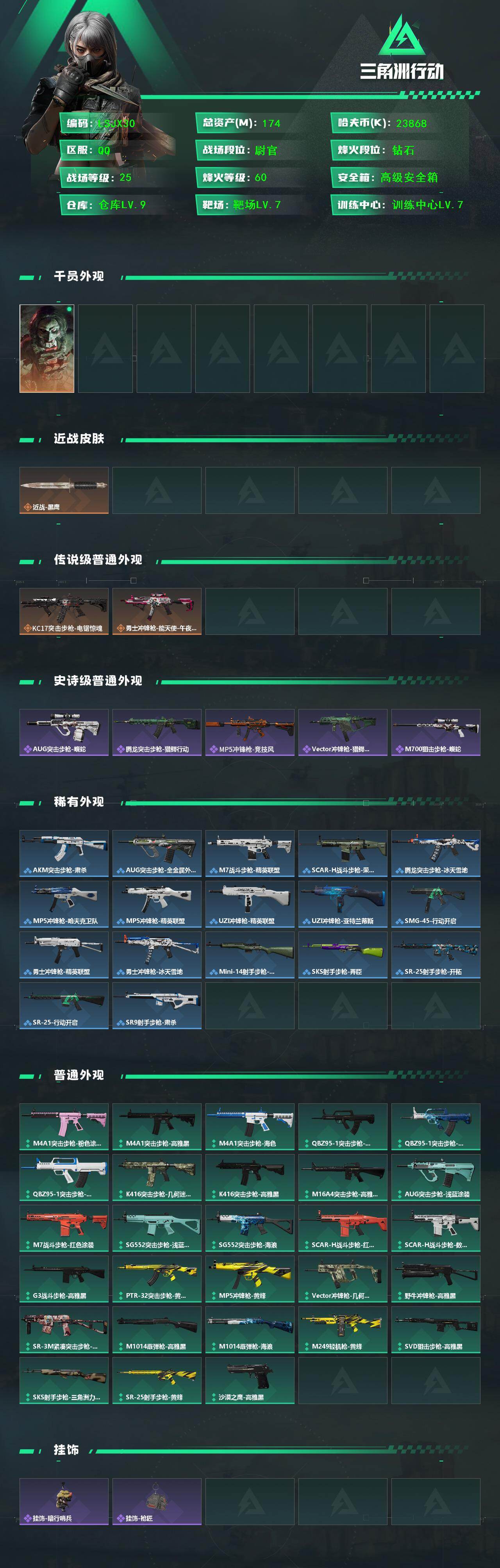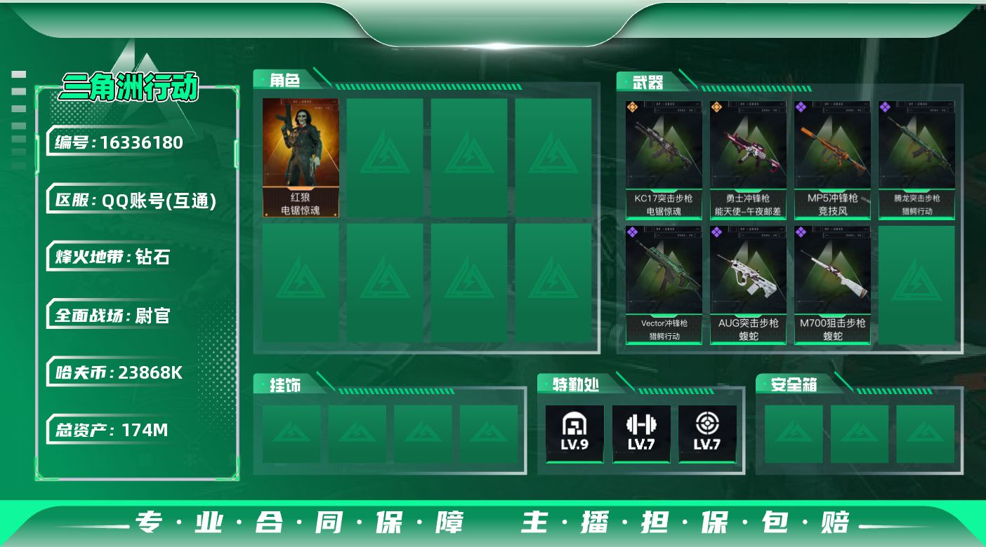[16336180]【特价出售/店主推荐】174m总资产-23868k哈伏币-60烽火等级-钻石-25战场等级-尉官 【干员外观】:红狼-电锯惊魂 【近战皮肤】:近战-黑鹰 【传说外观】:KC17突击步枪-电锯惊魂,勇士冲锋枪-能天使-午夜邮差 【史诗外观】:AUG突击步枪-蝮蛇,腾龙突击步枪-猎鳄行动,MP5冲锋枪-竞技风,Vector冲锋枪-猎鳄行动,M700狙击步枪-蝮蛇 【稀有外观】:AKM突击步枪-肃杀,AUG突击步枪-全金属外壳,M7战斗步枪-精英联盟,SCAR-H战斗步枪-荣耀列队,腾龙突击步枪-冰天雪地,MP5冲锋枪-哈夫克卫队,MP5冲锋枪-精英联盟,UZI冲锋枪-精英联盟,UZI冲锋枪-亚特兰蒂斯,SMG-45-行动开启,勇士冲锋枪-精英联盟,勇士冲锋枪-冰天雪地,Mini-14射手步枪-荣耀列队,SKS射手步枪-弄臣,SR-25射手步枪-开拓,SR-25-行动开启,SR9射手步枪-肃杀 【普通外观】:M4A1突击步枪-粉色涂装,M4A1突击步枪-高雅黑,M4A1突击步枪-海色,QBZ95-1突击步枪-高雅黑,QBZ95-1突击步枪-海浪,QBZ95-1突击步枪-海色,K416突击步枪-几何迷彩,K416突击步枪-高雅黑,M16A4突击步枪-高雅黑,AUG突击步枪-浅蓝涂装,M7战斗步枪-红色涂装,SG552突击步枪-浅蓝涂装,SG552突击步枪-海浪,SCAR-H战斗步枪-红色涂装,SCAR-H战斗步枪-数码迷彩,G3战斗步枪-高雅黑,PTR-32突击步枪-黄蜂,MP5冲锋枪-黄蜂,Vector冲锋枪-几何迷彩,野牛冲锋枪-高雅黑,SR-3M紧凑突击步枪-三角洲力量,M1014霰弹枪-高雅黑,M1014霰弹枪-海浪,M249轻机枪-黄蜂,SVD狙击步枪-高雅黑,SKS射手步枪-三角洲力量,SR-25射手步枪-黄蜂,沙漠之鹰-高雅黑 【挂饰】:挂饰-暗行哨兵*2,挂饰-枪匠
