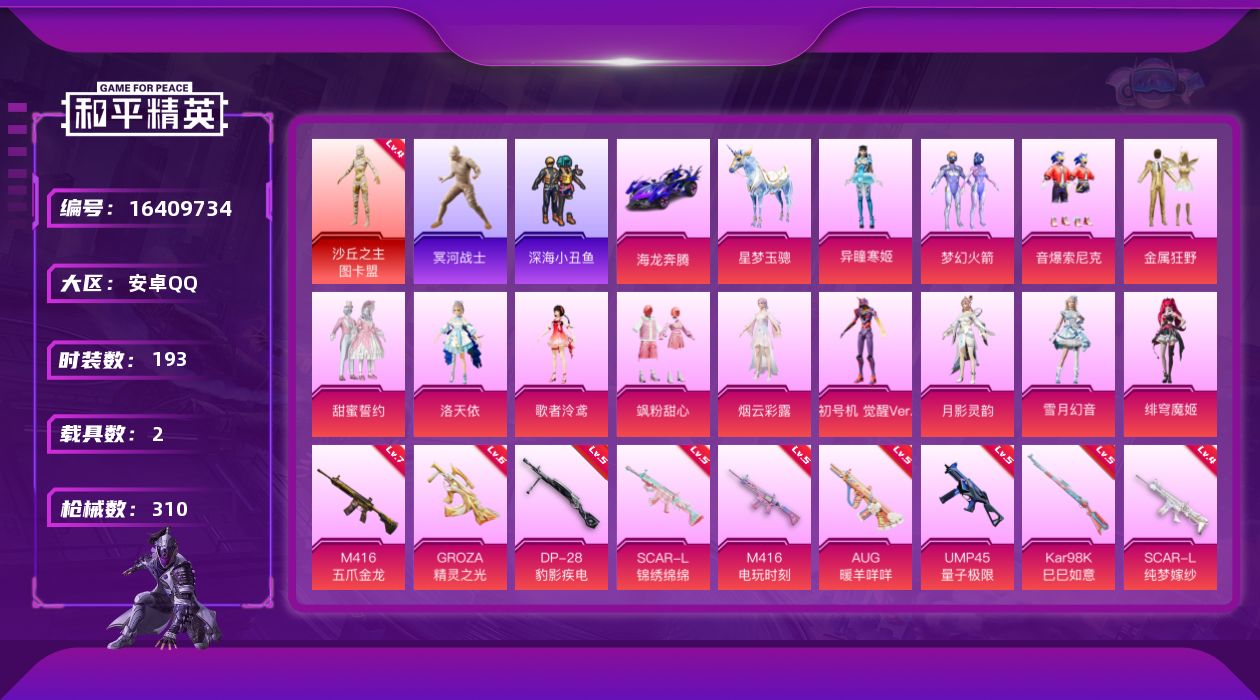 [16409734]【店主推荐捡漏号!可直接换绑】安卓 手Q-2神装-13粉装-18特效枪-2载具-14粉色飞行器-109824热力值-11王牌印记-193套装-310枪皮【红色神装等级】:暮色玫影-艾丽娅(一级),沙丘之主-图卡盟(四级)【红色角色神装】:暮色玫影-艾丽娅,沙丘之主-图卡盟【热门品类】:粉装-梦幻火箭,粉装-音爆索尼克,套装-冥河战士,套装-深海小丑鱼,套装-小丑鱼,角色-2P战斗服款,套装-龟仙人,角色-8号机,角色-Mark.06【粉色套装】:粉装-梦幻火箭,粉装-金属狂野,粉装-甜蜜誓约,角色-洛天依,角色-歌者泠鸢,粉装-音爆索尼克,粉装-飒粉甜心,角色-烟云彩露,角色-初号机 觉醒Ver.,角色-月影灵韵,粉装-雪月幻音,角色-绯穹魔姬,角色-异瞳寒姬【粉色枪皮等级】:AKM-暮色玫影(三级),SCAR-L-纯梦嫁纱(四级),SCAR-L-锦绣绵绵(五级),M416-五爪金龙(七级),M416-电玩时刻(五级),GROZA-精灵之光(六级),AUG-星之彼岸(一级),AUG-星梦奇缘(三级),AUG-暖羊咩咩(五级),蜜獾-异瞳寒姬(三级),UMP45-量子极限(五级),UMP45-宇宙意志(三级),AKS-74U-森灵之息(五级),Kar98K-巳巳如意(五级),Mk14-盛世惊鸿(三级),M200-梦海之灵(三级),DP-28-暗夜鎏金(四级),DP-28-豹影疾电(五级)【粉色载具】:海龙奔腾,星梦玉骢【粉色枪皮】:AKM-暮色玫影,SCAR-L-纯梦嫁纱,SCAR-L-锦绣绵绵,M416-五爪金龙,M416-电玩时刻,GROZA-精灵之光,AUG-星之彼岸,AUG-星梦奇缘,AUG-暖羊咩咩,蜜獾-异瞳寒姬,UMP45-量子极限,UMP45-宇宙意志,AKS-74U-森灵之息,Kar98K-巳巳如意,Mk14-盛世惊鸿,M200-梦海之灵,DP-28-暗夜鎏金,DP-28-豹影疾电【粉色飞行器】:梦幻火箭飞行器,天之羽翼飞行器,千面幻镜飞行器,繁龙极客飞行器,镜域双华-灵镜之阶,龙翔九天飞行器,幻海精灵飞行器,深渊漩涡飞行器,曦光华影飞行器,凤舞九天飞行器,灵珠游龙飞行器,暮色之舞飞行器