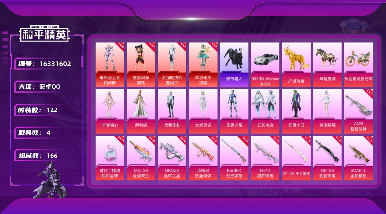 - [12955963]素材身法号 苹果 手Q-2神装-19粉装-9特效枪-3载具-3粉色飞行器-3.7w热力值-2王牌印记-63套装-79枪皮【红色神装等级】:魔童闹海-敖丙(一级),魔童闹海-哪吒(二级)【热门品类】:粉装-怪诞乔克,粉装-梦幻火箭,粉装-童趣迷兔,套装-赤蝎幽灵,套装-都市猎人,套装-胖达团团,小丑红鼻头,套装-红熊茄茄【粉色载具】:僚机-冰龙团团,黑曜夜骑,冰绡玉鳞【粉色套装】:粉装-怪诞乔克,粉装-梦幻火箭,粉装-放客神游,粉装-冰霜白皇,粉装-童趣迷兔,粉装-炙焰红王,粉装-彩虹鹿灵,角色-洛天依,粉装-甜梦小狐,粉装-暖熊萌萌,粉装-冰川红玫,粉装-仲夏莫吉托,角色-严莉莉,角色-荧海星豚,角色-绯穹魔姬,角色-奇迹舞步 美琪,角色-奇迹舞步 美雪,角色-花灵,角色-羊梦糖心【粉色枪皮等级】:SCAR-L-甜梦小狐(四级),M416-灵猫魔法师(三级),蜜獾-荧海星豚(四级),Vector-绯穹魔姬(四级),P90-魔童闹海 敖丙(二级),DP-28-豹影疾电(五级),MG3-洛神天依(二级),MG-36-沧焰双生(四级),平底锅-喜羊羊与灰太狼(三级)【粉色飞行器】:灵猫魔法师飞行器,灵珠游龙飞行器