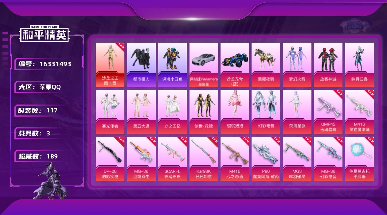 [16331493]苹果 手Q-无敌战神框-1神装-10粉装-13特效枪-3载具-6粉色飞行器-68889热力值-8王牌印记-117套装-189枪皮