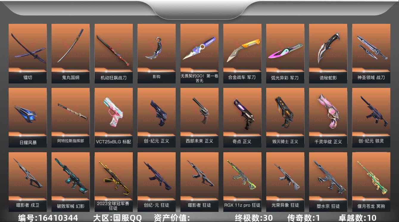 [16410344]【套装】:创·纪元套装,离火刃套装,离火刃套装 【英雄】:幻棱,炼狱,维斯,暮蝶,钛狐,壹决,铁臂,捷风,雷兹,幽影,不死鸟,贤者,猎枭,蝰蛇,零,芮娜,奇乐,尚勃勒,霓虹,斯凯,夜露,星礈,K/O,海神,盖可,黑梦,钢锁 【近战武器】:近战武器-影钩,近战武器-无畏契约GO!第一卷 苦无,近战武器-离火刃,近战武器-镭切,近战武器-鬼丸国纲,近战武器-合金战车 军刀,近战武器-弧光异彩 军刀,近战武器-机动狂飙 战刀,近战武器-诡秘蛇影 军刀,近战武器-神圣领域 战刀,近战武器-日耀风暴 遗器,近战武器-阿特拉斯指挥部 甩棍 【狂徒】:狂徒-超时空卫队,狂徒-2023全球冠军赛,狂徒-塑水宗,狂徒-创·纪元,狂徒-噬影者,狂徒-RGX 11z Pro,狂徒-光荣异象,狂徒-堕天遗武,狂徒-盖亚的复仇,狂徒-紫阙金琅,狂徒-弧光异彩,狂徒-诡秘蛇影,狂徒-极简主义//2.0 【幻影】:幻影-破败军械,幻影-侦察力量,幻影-神中神罚,幻影-合金战车,幻影-噬源兽防卫工程,幻影-神圣领域,幻影-末日之翼 【戍卫】:戍卫-噬影者,戍卫-掠影,戍卫-彩梦之城,戍卫-花漾粉红,戍卫-月球哨兵,戍卫-折光棱晶 【獠犬】:獠犬-弧光异彩,獠犬-神圣领域,獠犬-数码咒术 【冥驹】:冥驹-偃月苍龙,冥驹-光荣异象,冥驹-离子武器,冥驹-花漾粉红,冥驹-星云暗涌 【飞将】:飞将-合金战车,飞将-信手涂鸦,飞将-末日之翼 【莽侠】:莽侠-创·纪元,莽侠-诡秘蛇影,莽侠-月球哨兵 【战神】:战神-神圣领域,战神-数码咒术 【奥丁】:奥丁-紫阙金琅//2.0,奥丁-信手涂鸦,奥丁-末日之翼 【判官】:判官-诡秘蛇影,判官-数码咒术 【雄鹿】:雄鹿-彩梦之城,雄鹿-月球哨兵 【骇灵】:骇灵-创·纪元,骇灵-花漾粉红,骇灵-信手涂鸦,骇灵-星云暗涌 【蜂刺】:蜂刺-合金战车,蜂刺-弧光异彩,蜂刺-星云暗涌,蜂刺-折光棱晶 【标配】:标配-紫阙金琅,标配-彩梦之城,标配-折光棱晶 【VCT手枪】:标配-VCT25 x BLG 【正义】:正义-毁灭骑士,正义-奇点,正义-千灵华绽,正义-创·纪元,正义-西部未来,正义-合金战车,正义-纳米打击,正义-游戏结束,正义-月球哨兵 【鬼魅】:鬼魅-天界神兵,鬼魅-诡秘蛇影,鬼魅-数码咒术,鬼魅-信手涂鸦,鬼魅-星云暗涌 【狂怒】:狂怒-神圣领域,狂怒-花