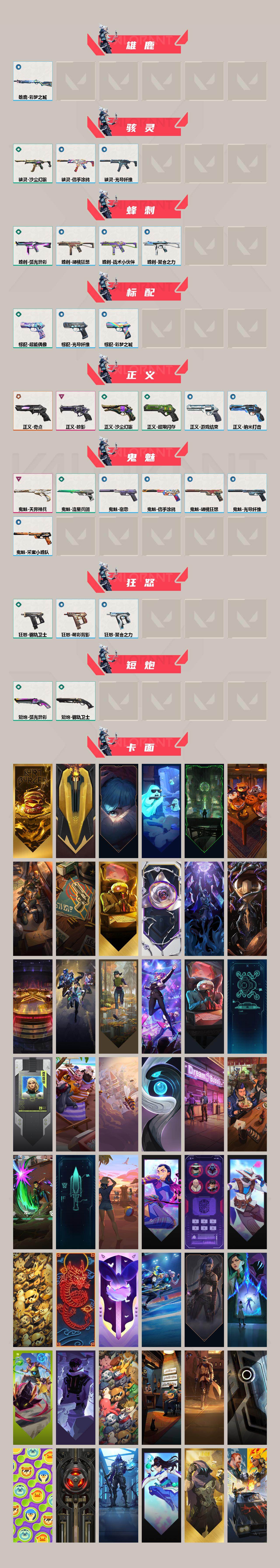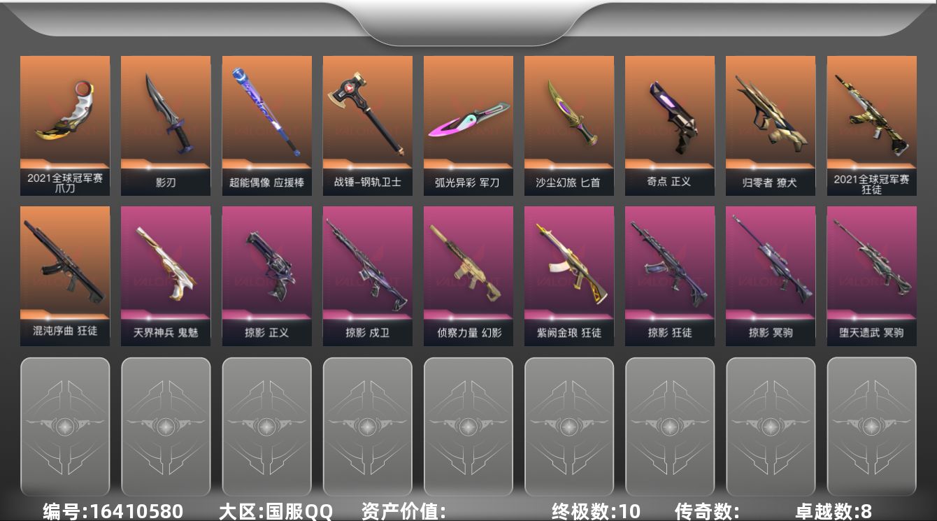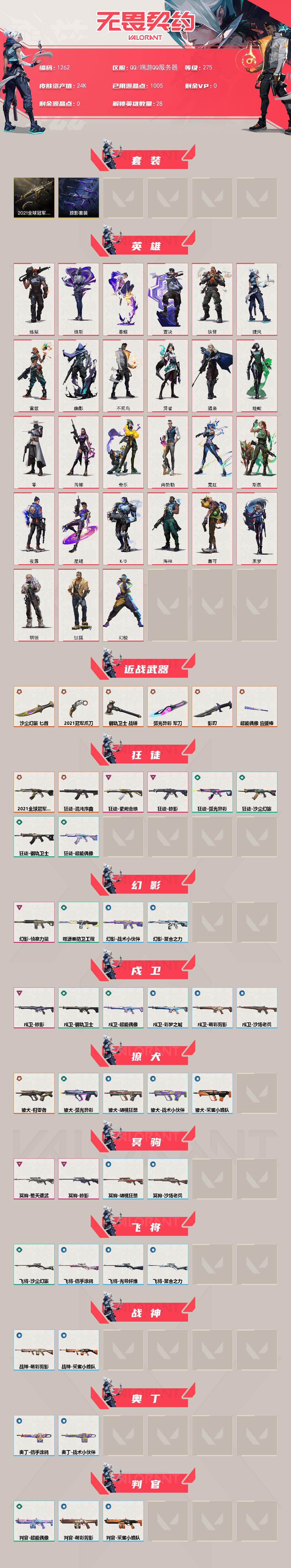 [16410580]【套装】:2021全球冠军赛套装,掠影套装 【英雄】:幻棱,炼狱,维斯,暮蝶,钛狐,壹决,铁臂,捷风,雷兹,幽影,不死鸟,贤者,猎枭,蝰蛇,零,芮娜,奇乐,尚勃勒,霓虹,斯凯,夜露,星礈,K/O,海神,盖可,黑梦,钢锁 【近战武器】:近战武器-2021全球冠军赛 爪刀,近战武器-超能偶像 应援棒,近战武器-钢轨卫士 战锤,近战武器-弧光异彩 军刀,近战武器-沙尘幻旅 匕首,近战武器-影刃 【狂徒】:狂徒-2021全球冠军赛,狂徒-混沌序曲,狂徒-掠影,狂徒-紫阙金琅,狂徒-超能偶像,狂徒-钢轨卫士,狂徒-弧光异彩,狂徒-沙尘幻旅 【幻影】:幻影-侦察力量,幻影-噬源兽防卫工程,幻影-聚合之力,幻影-战术小伙伴 【戍卫】:戍卫-掠影,戍卫-超能偶像,戍卫-钢轨卫士,戍卫-彩梦之城,戍卫-萌彩剪影,戍卫-沙场老兵 【獠犬】:獠犬-归零者,獠犬-弧光异彩,獠犬-采蜜小蜂队,獠犬-胡桃狂想,獠犬-战术小伙伴 【冥驹】:冥驹-堕天遗武,冥驹-掠影,冥驹-胡桃狂想,冥驹-沙场老兵 【飞将】:飞将-沙尘幻旅,飞将-聚合之力,飞将-信手涂鸦,飞将-光导纤维 【战神】:战神-采蜜小蜂队,战神-萌彩剪影 【奥丁】:奥丁-信手涂鸦,奥丁-战术小伙伴 【判官】:判官-超能偶像,判官-采蜜小蜂队,判官-萌彩剪影 【雄鹿】:雄鹿-彩梦之城 【骇灵】:骇灵-沙尘幻旅,骇灵-光导纤维,骇灵-信手涂鸦 【蜂刺】:蜂刺-弧光异彩,蜂刺-胡桃狂想,蜂刺-聚合之力,蜂刺-战术小伙伴 【标配】:标配-超能偶像,标配-彩梦之城,标配-光导纤维 【正义】:正义-奇点,正义-掠影,正义-超限闪存,正义-沙尘幻旅,正义-纳米打击,正义-游戏结束 【鬼魅】:鬼魅-天界神兵,鬼魅-流星兵团,鬼魅-采蜜小蜂队,鬼魅-光导纤维,鬼魅-胡桃狂想,鬼魅-宿怨,鬼魅-信手涂鸦 【狂怒】:狂怒-钢轨卫士,狂怒-聚合之力,狂怒-萌彩剪影 【短炮】:短炮-钢轨卫士,短炮-弧光异彩 【卡面】:终章:激斗汉堡 卡面,进入射程 卡面,《双城之战》拥抱 卡面,精灵大战 卡面,欢迎来到底城 卡面,南瓜盛典 卡面,修车达人 卡面,正义的化身 卡面,终章:生意人麦宝 卡面,铁之华 卡面,失而复得 卡面,时间到 卡面,最高舞台 卡面,复活专家 卡面,归乡 // 蝰蛇 卡面,超能偶像 卡面,生意人麦宝 卡面,声感陷阱设计图 卡面,钢锁工牌 卡面,战术