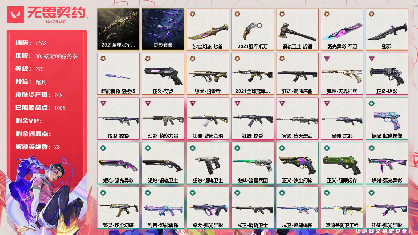 - [12958001]【英雄】:炼狱,暮蝶,捷风,幽影,不死鸟,贤者,猎枭,芮娜,尚勃勒,霓虹,夜露,黑梦 【狂徒】:狂徒-日冕雄师 【卡面】:无垠星环 卡面,《双城之战》金克丝 卡面,代号红色 卡面,新兵报到 卡面,V契约 卡面,无畏契约 卡面 【喷漆】:致命优雅 喷漆,霓光四射 喷漆,关门放狗 喷漆,胜利属于无畏契约 喷漆,GLHF 喷漆,无畏契约 喷漆 【挂饰】:无畏契约GO!第一卷 零 挂饰,无畏契约 纪念币 挂饰